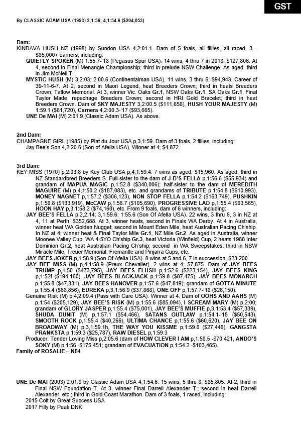 | Une De Mai | Classis Adam USA | Kindava Hush NZ | Brian Dorans |