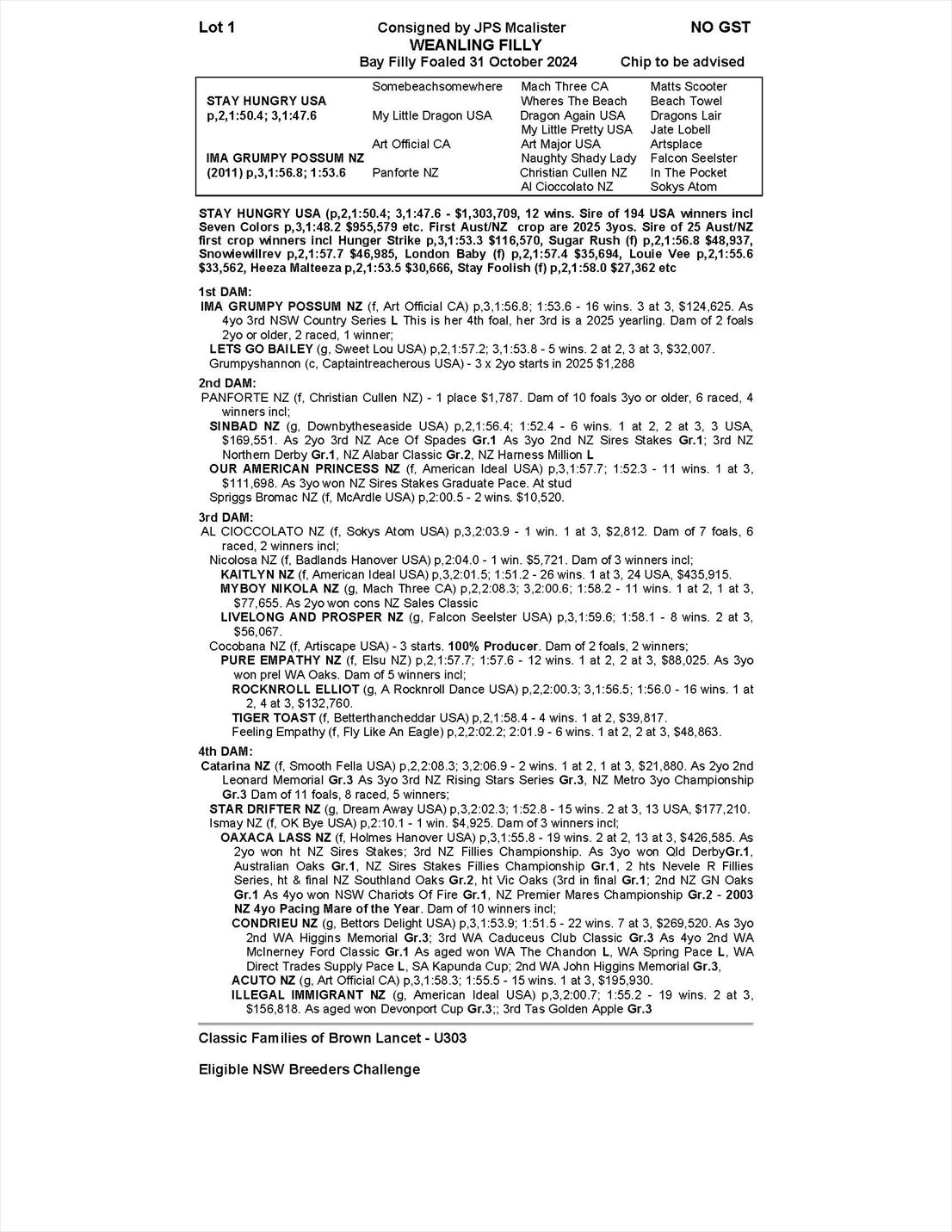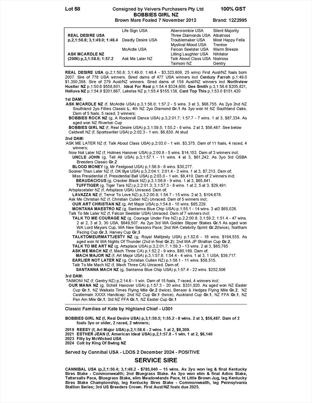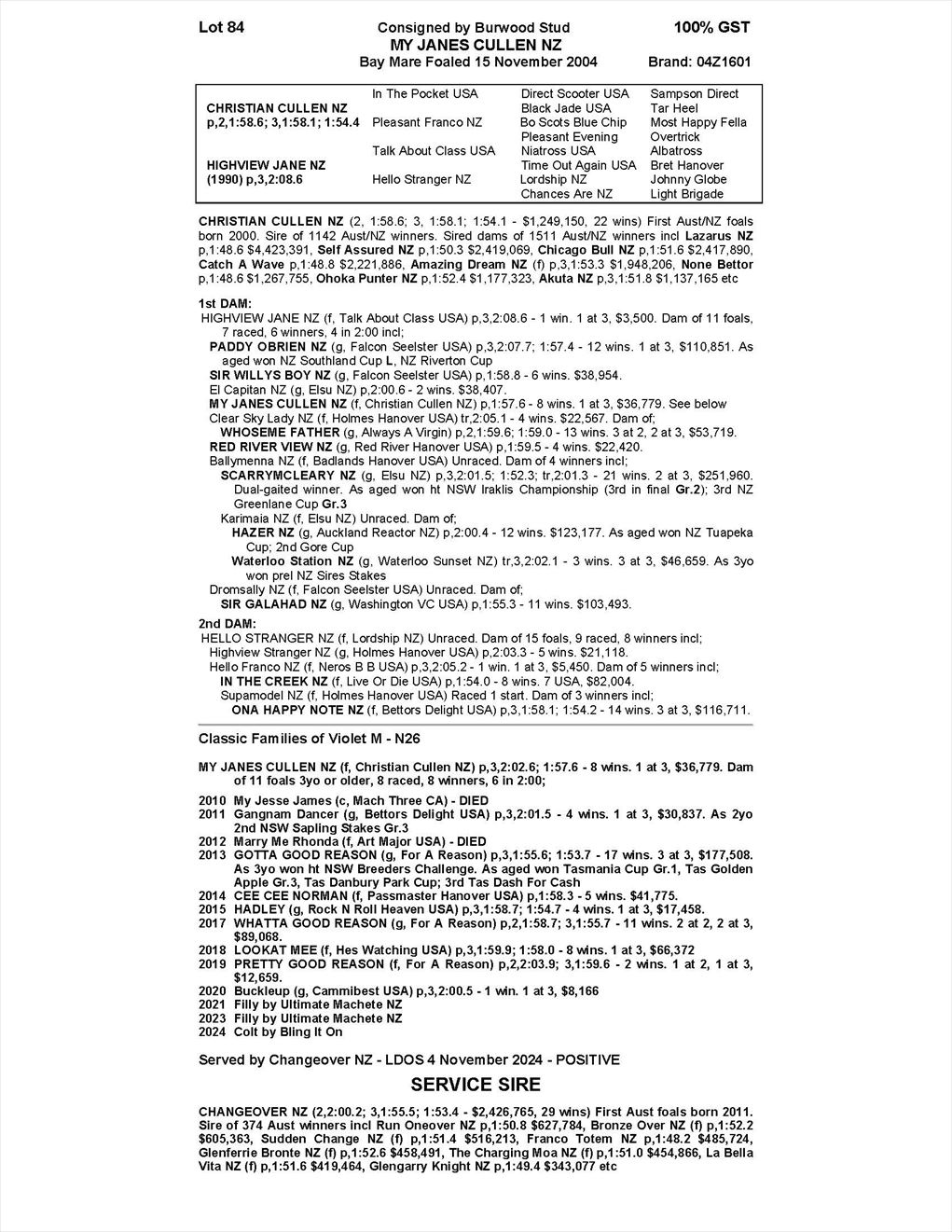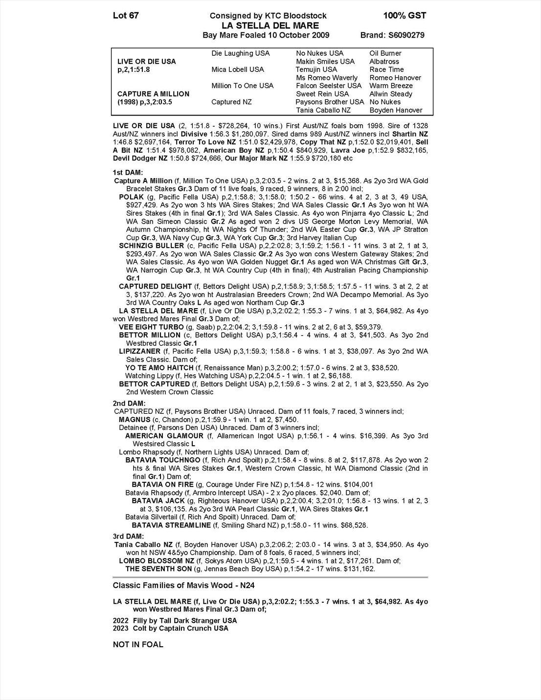 | Mare(+) | Miss Madoff NZ | McArdle USA | Caps Off (NZ) | KTC Bloodstock | WA | Woodanookie Pacing | $300 |