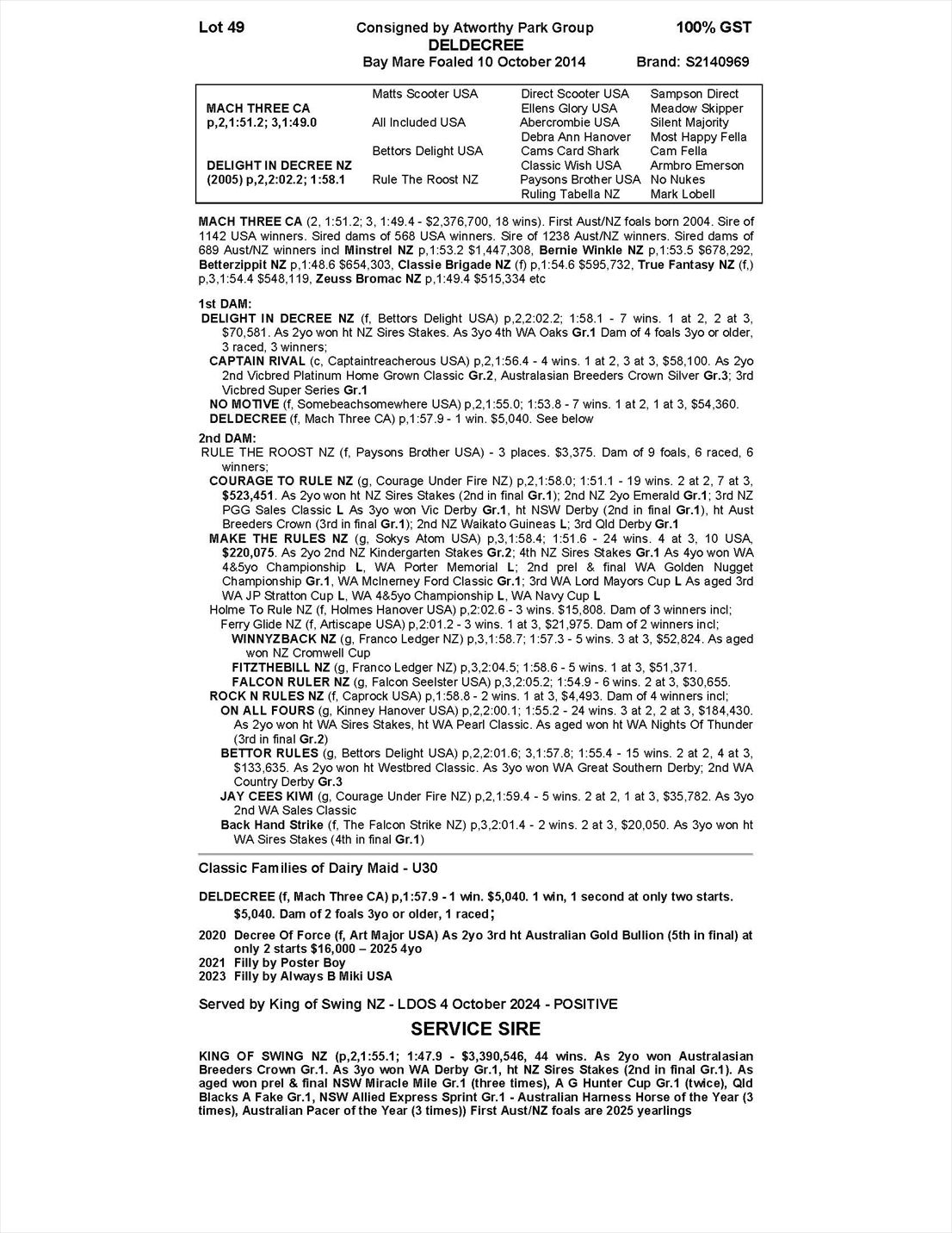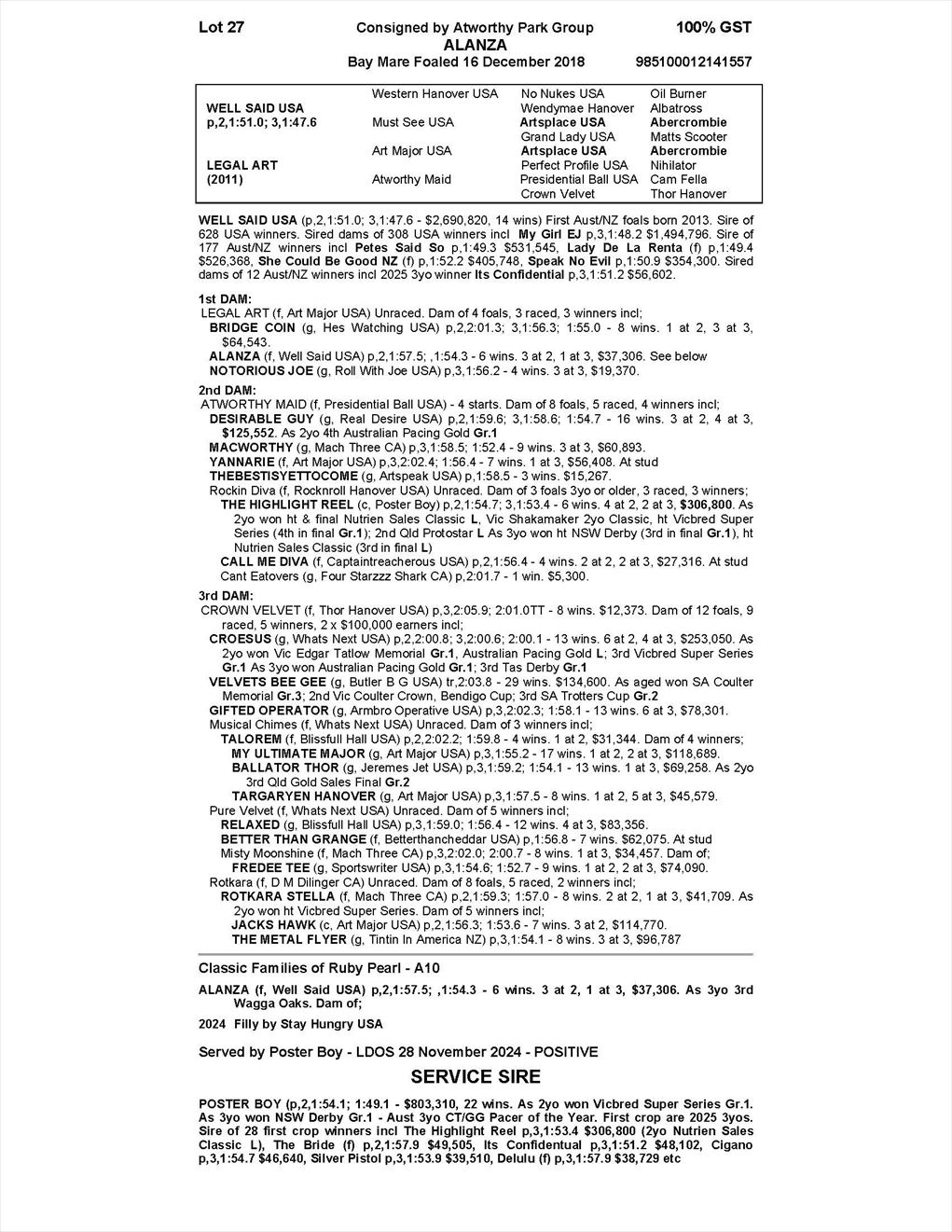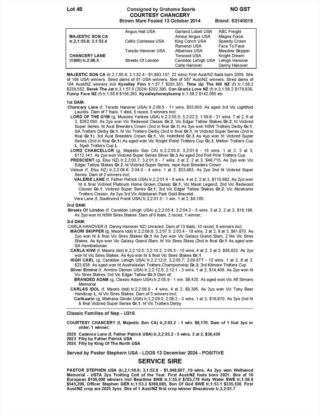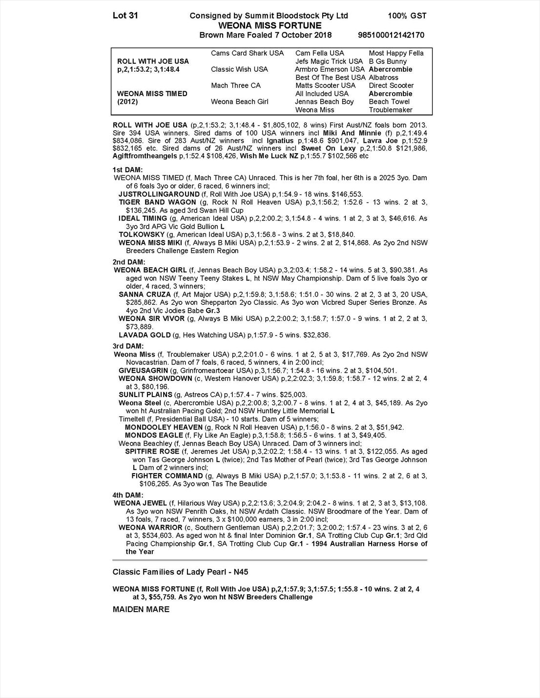 | Mare(+) | Miss Madoff NZ | McArdle USA | Caps Off (NZ) | KTC Bloodstock | WA | Woodanookie Pacing | $300 |