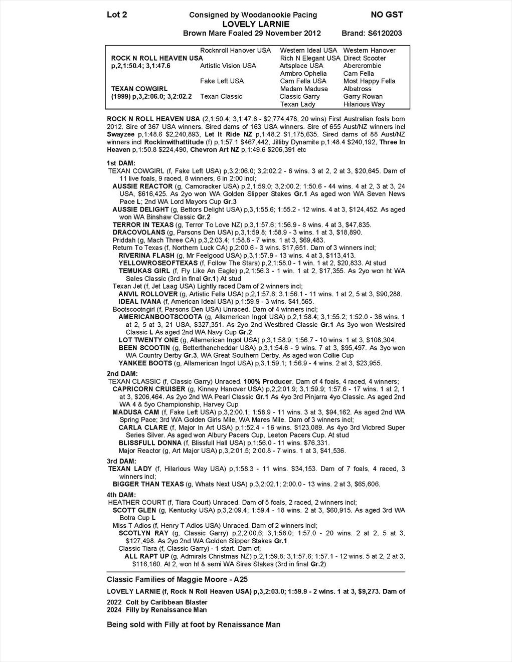 | Mare(+) | Lovely Larnie | Rock N Roll Heaven USA | Texan Cowgirl | Woodanookie Pacing | WA |