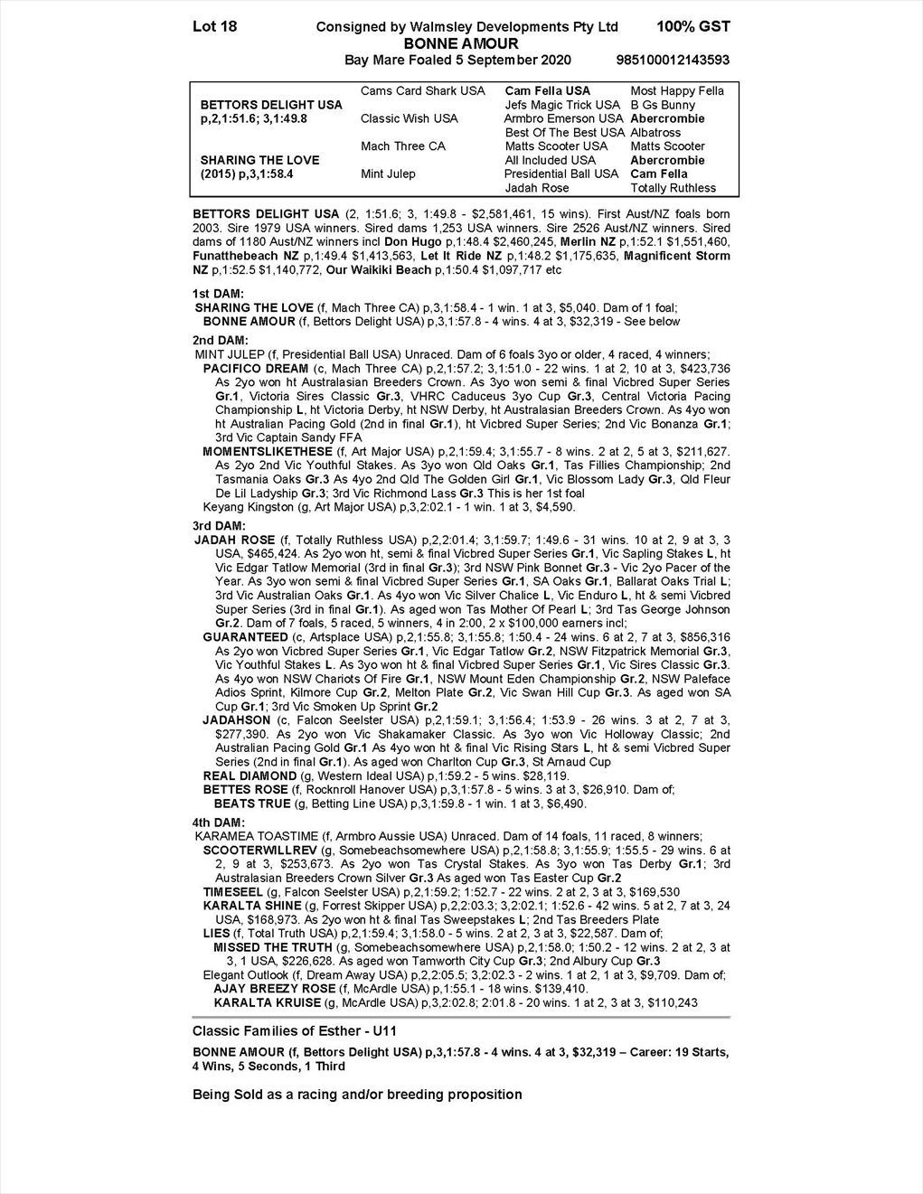| Mare | Bonne Amour | Bettors Delight USA | Sharing The Love | Walmsley Developments Pty Ltd | WA |