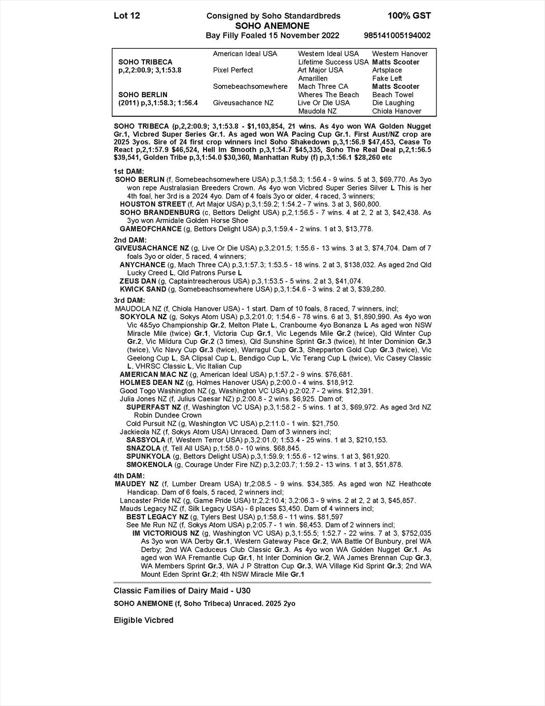 | Filly | Soho Anemone | Soho Tribeca | Soho Berlin | Soho Standardbreds | VIC | Greg & Stacey Brown | $700 |