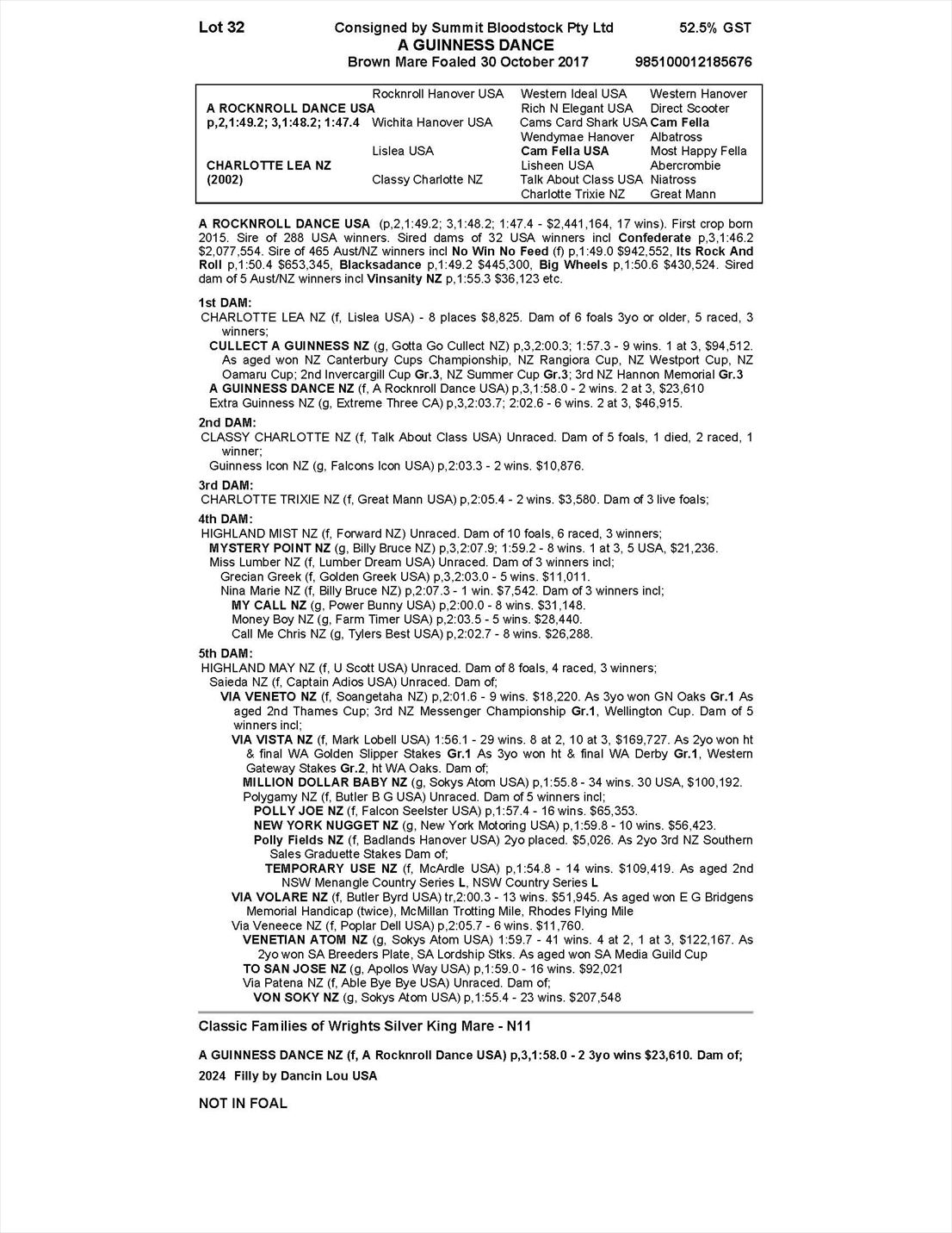 | Mare | A Guinness Dance NZ | A Rocknroll Dance USA | Charlotte Lea (NZ) | Summit Bloodstock Pty Ltd | QLD | Darren Ebert | $300 |