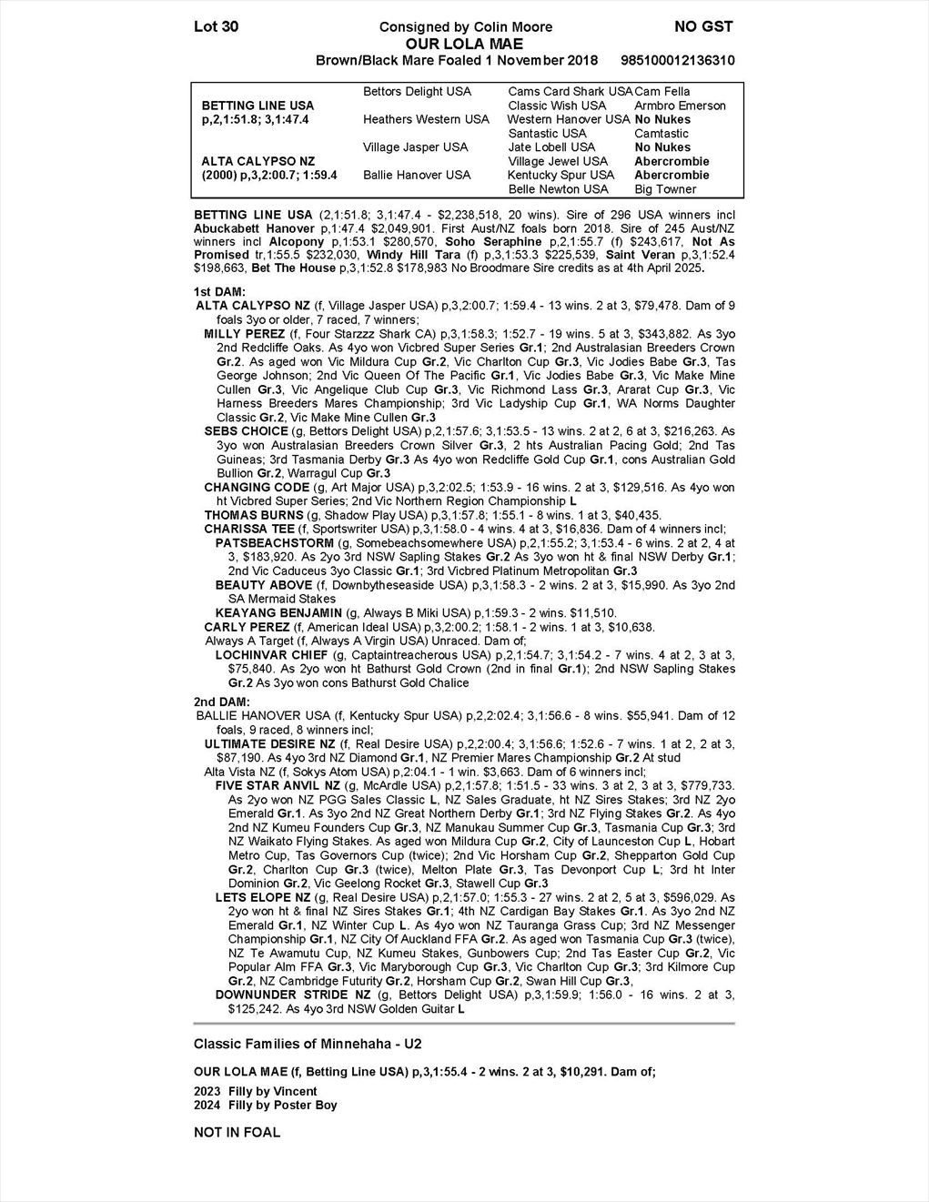 | Mare | Our Lola Mae | Betting Line USA | Alta Calypso NZ | Colin Moore | VIC |