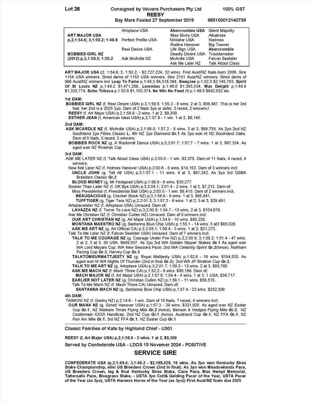| Mare(+) | Reesy | Art Major USA | Bobbies Girl NZ | Veivers Purchases Pty Ltd | QLD | Ross Angove | $12,000 |