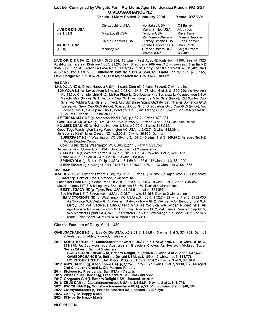 | Mare | Giveusachance NZ | Live Or Die USA | Maudola (NZ) | Wingate Farm Pty Ltd (as agent for) Jessica Francis | NSW | G.Stebbing | $1,500 |