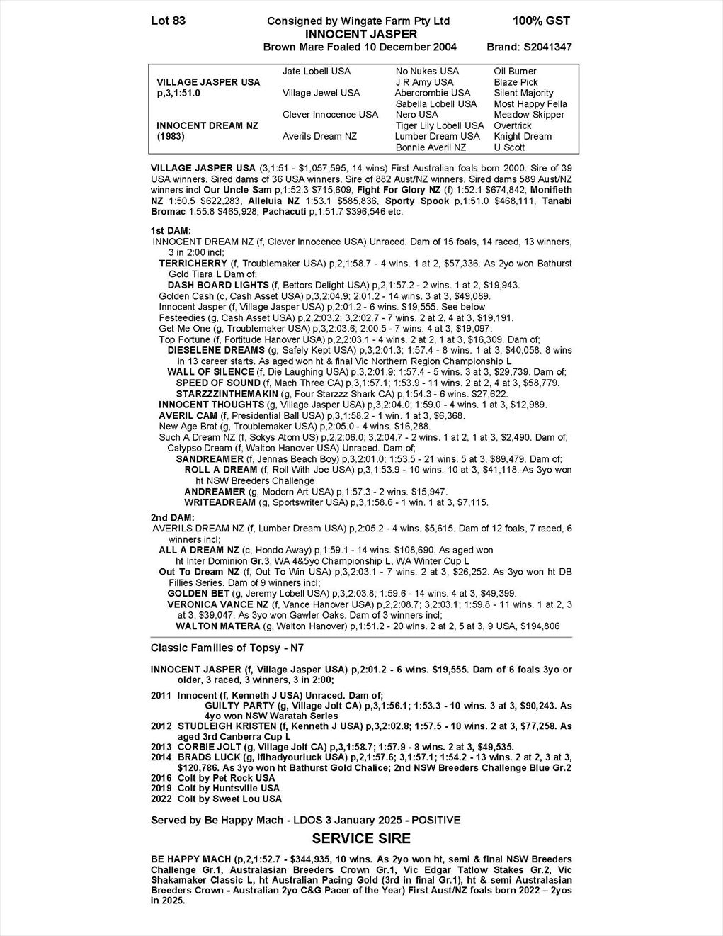 | Mare(+) | Innocent Jasper | Village Jasper USA | Innocent Dream | Wingate Farm Pty Ltd | NSW |