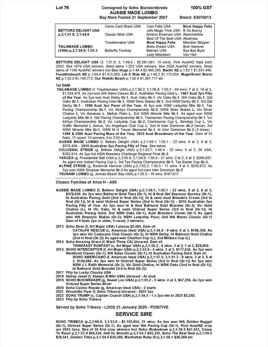 | Mare(+) | Aussie Made Lombo | Bettors Delight USA | Tailamade Lombo | Soho Standardbreds | WA | Tourello Standardbred Stud P/L | $3,000 |