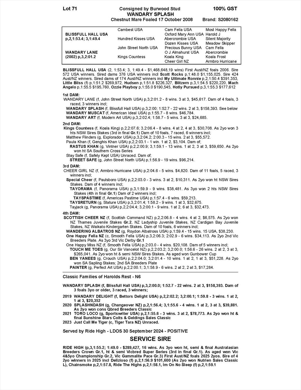 | Mare(+) | Wandary Splash | Blissfull Hall USA | Wandary Lane | Burwood Stud | QLD |