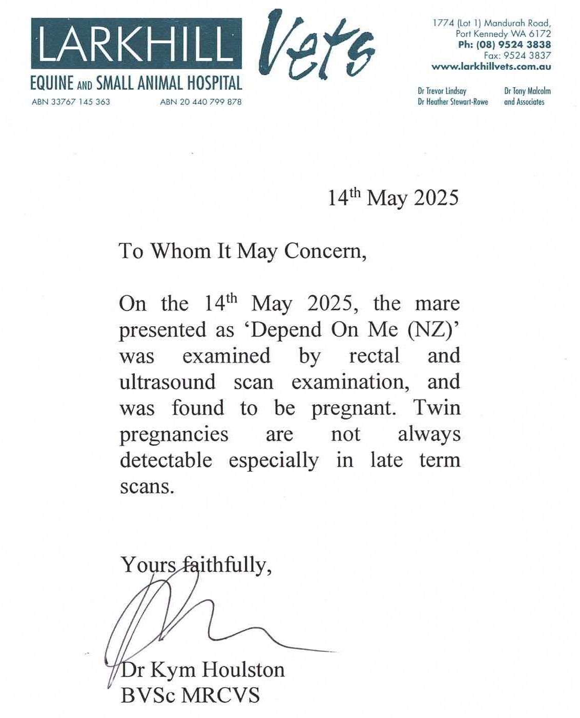 | Mare(+) | Depend On Me NZ | Bettors Delight USA | Splendid Deal (NZ) | KTC Bloodstock | WA |
