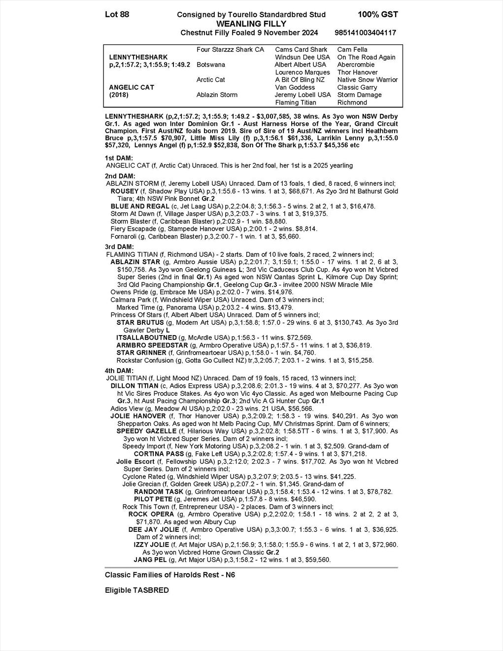 | Filly | Unnamed | Lennytheshark | Angelic Cat | Tourello Standardbred Stud | TAS |