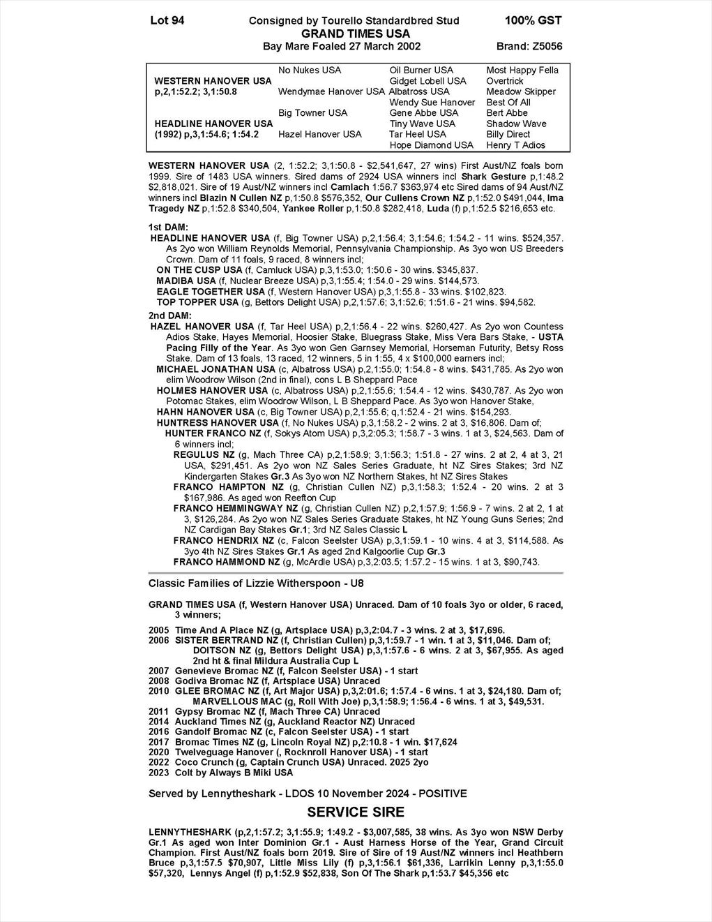 | Mare(+) | Grand Times USA | Western Hanover(US) | Headline Hanover (US) | Tourello Standardbred Stud | TAS | Lost The Plot Racing | $300 |