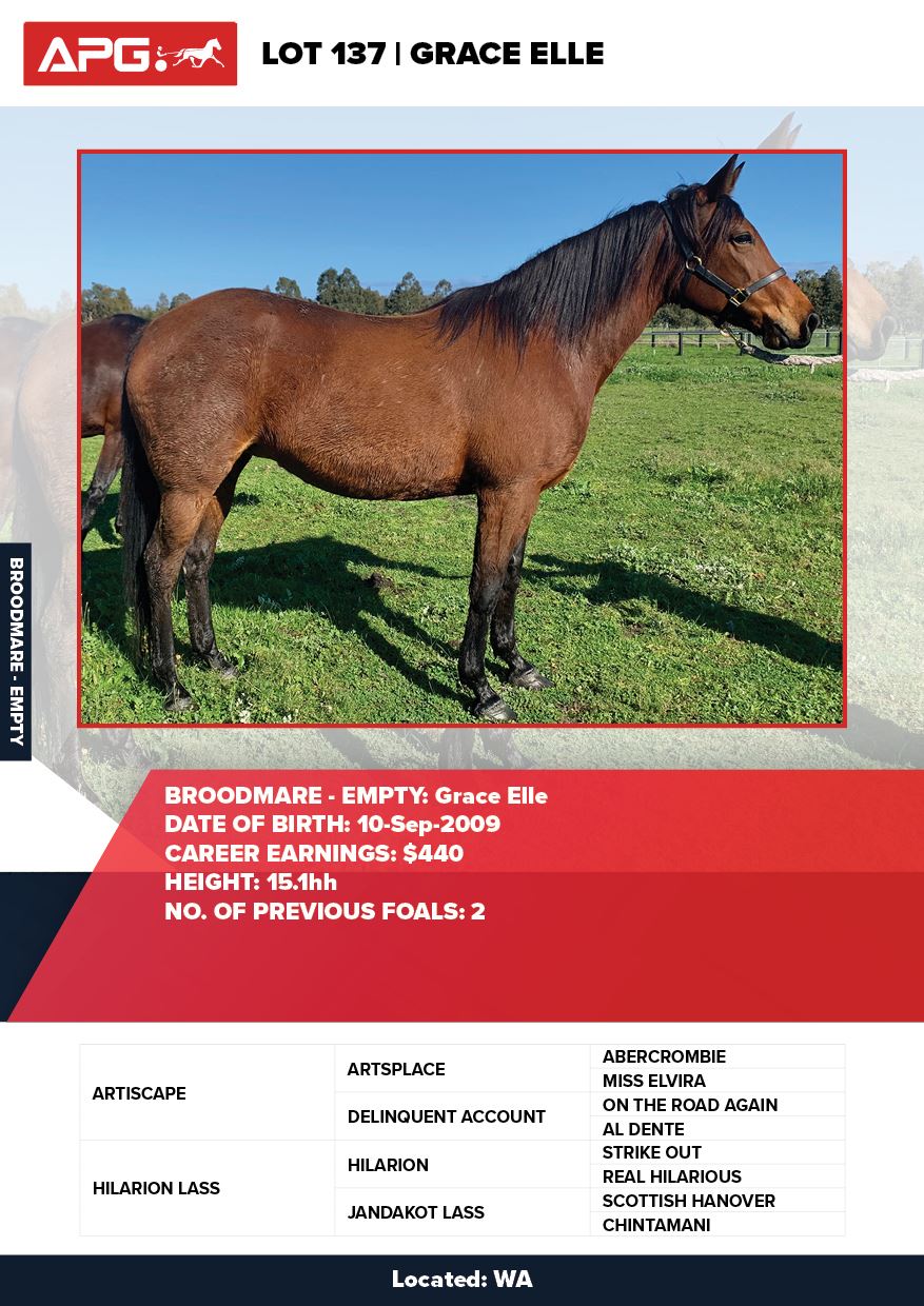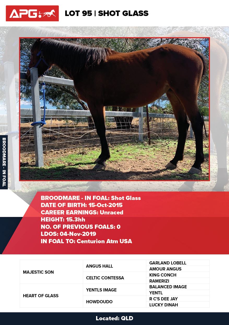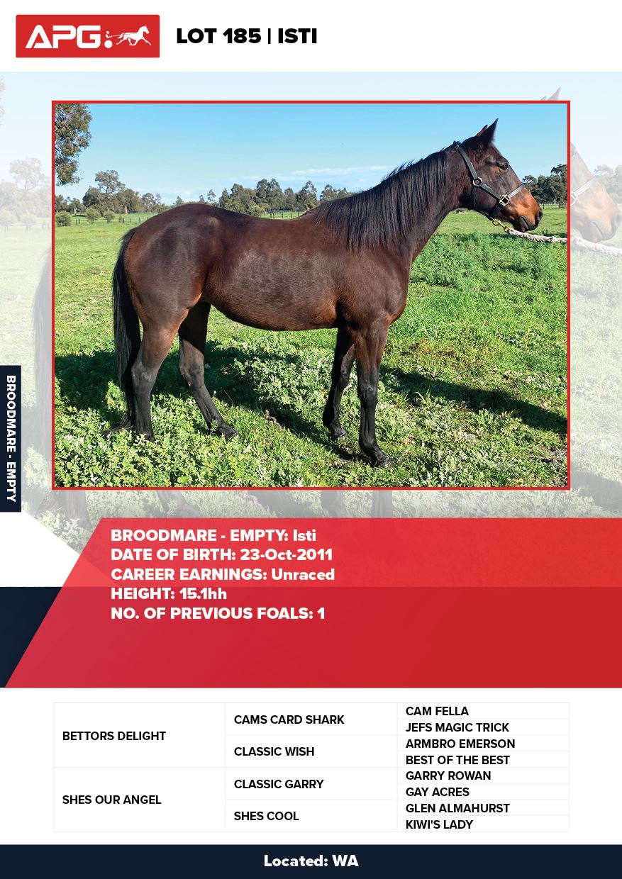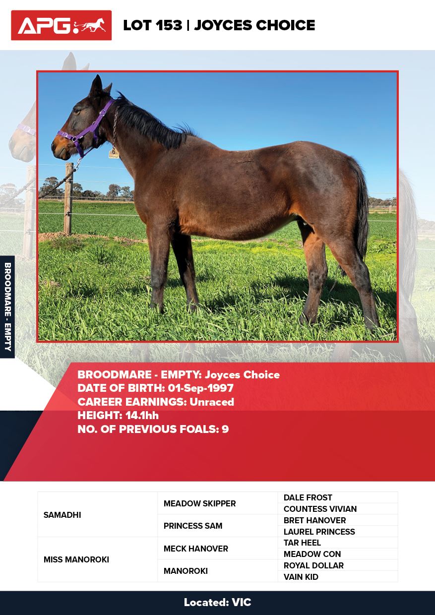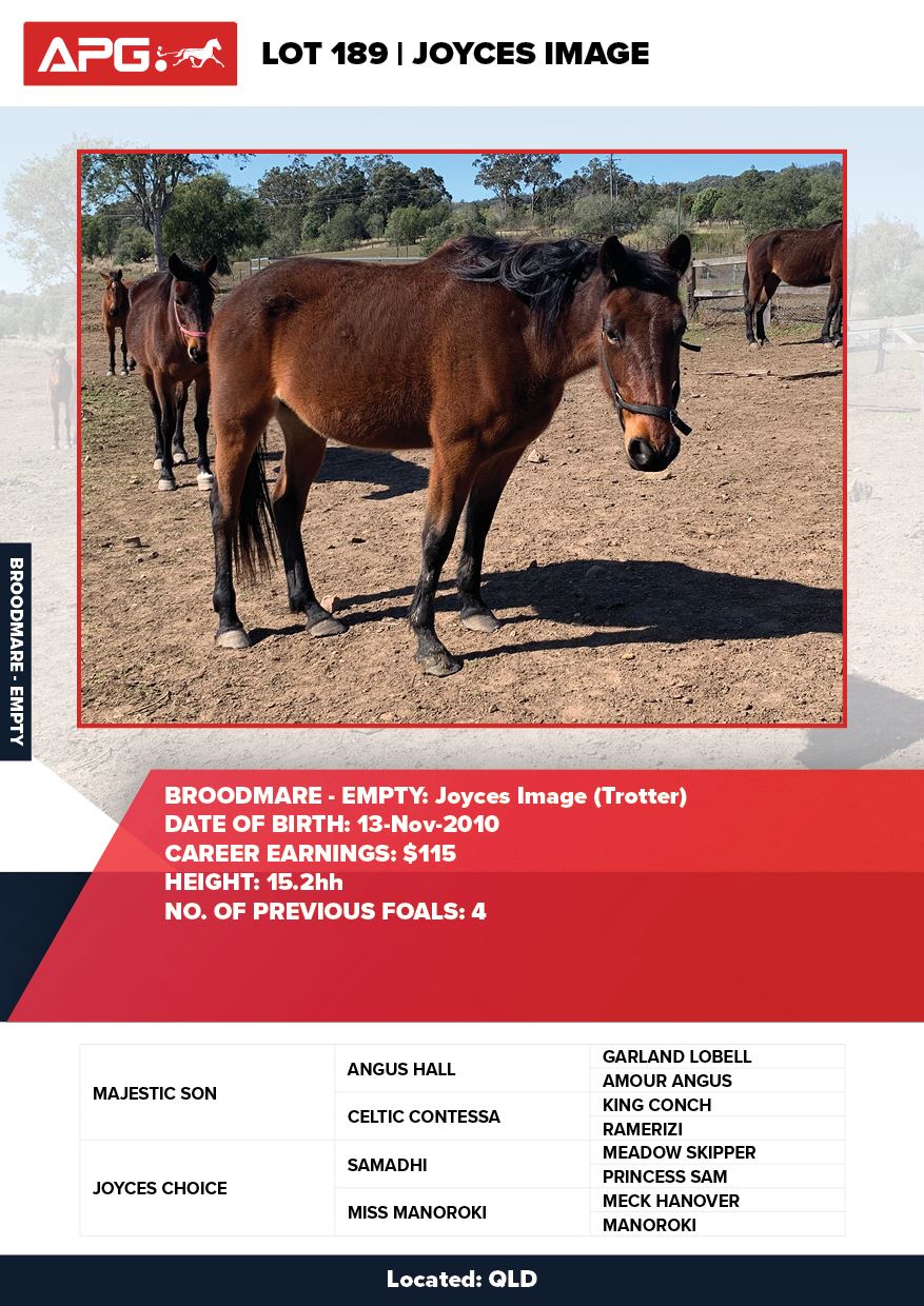 | Mare | Joyces Image | Majestic Son CA | Joyces Choice | Trump Bloodstock | QLD | Youngson | $1,500 |