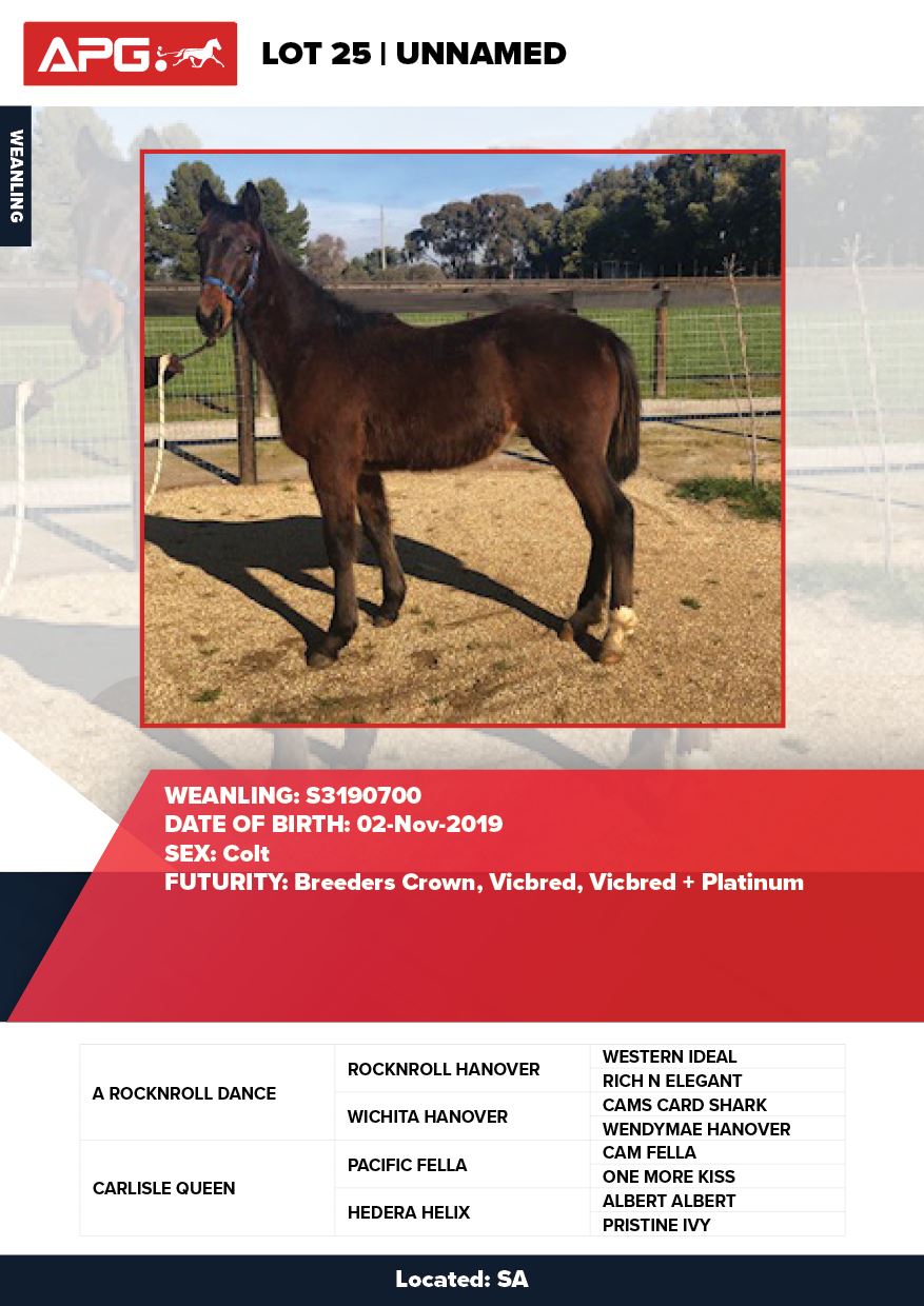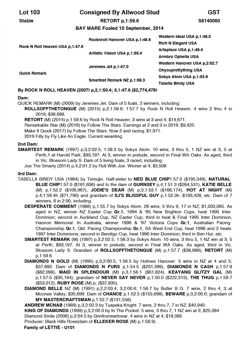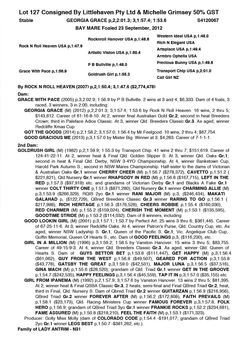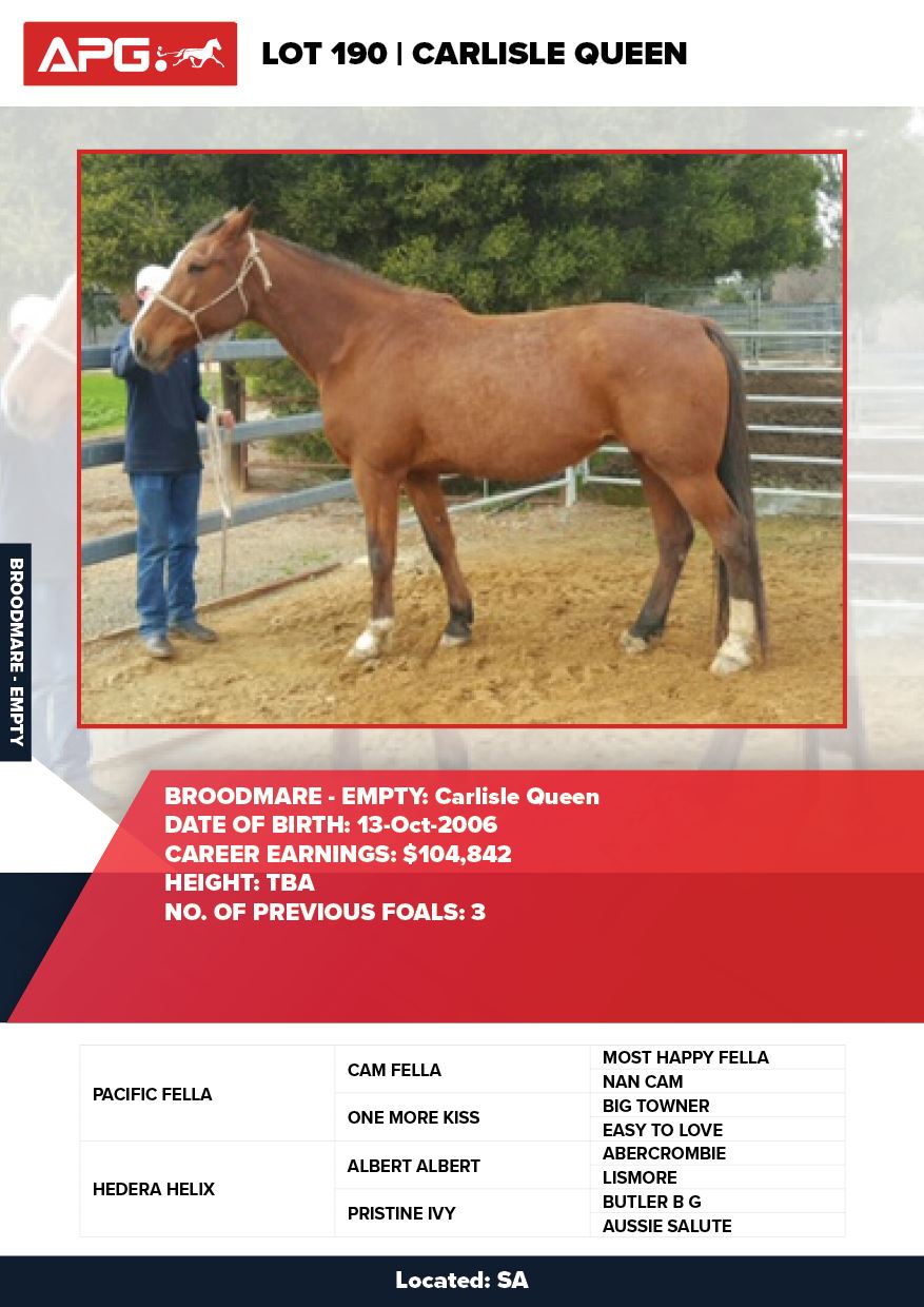 | Mare | Carlisle Queen | Pacific Fella USA | Hedera Helix | George Smith | SA | R Talent | $600 |