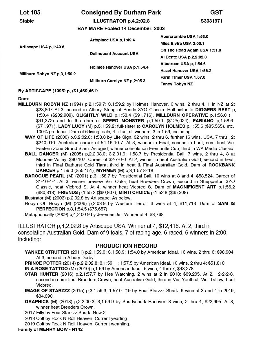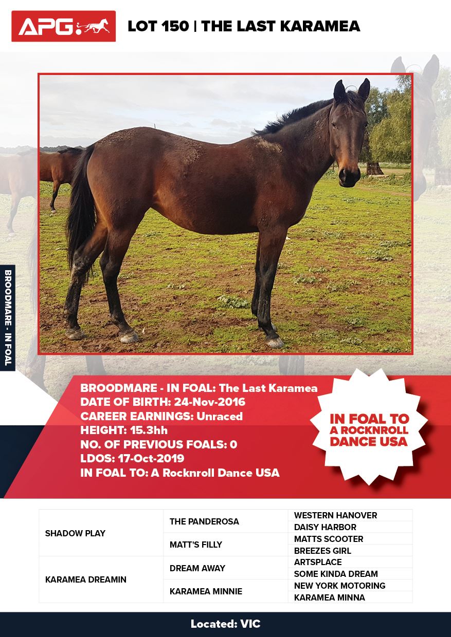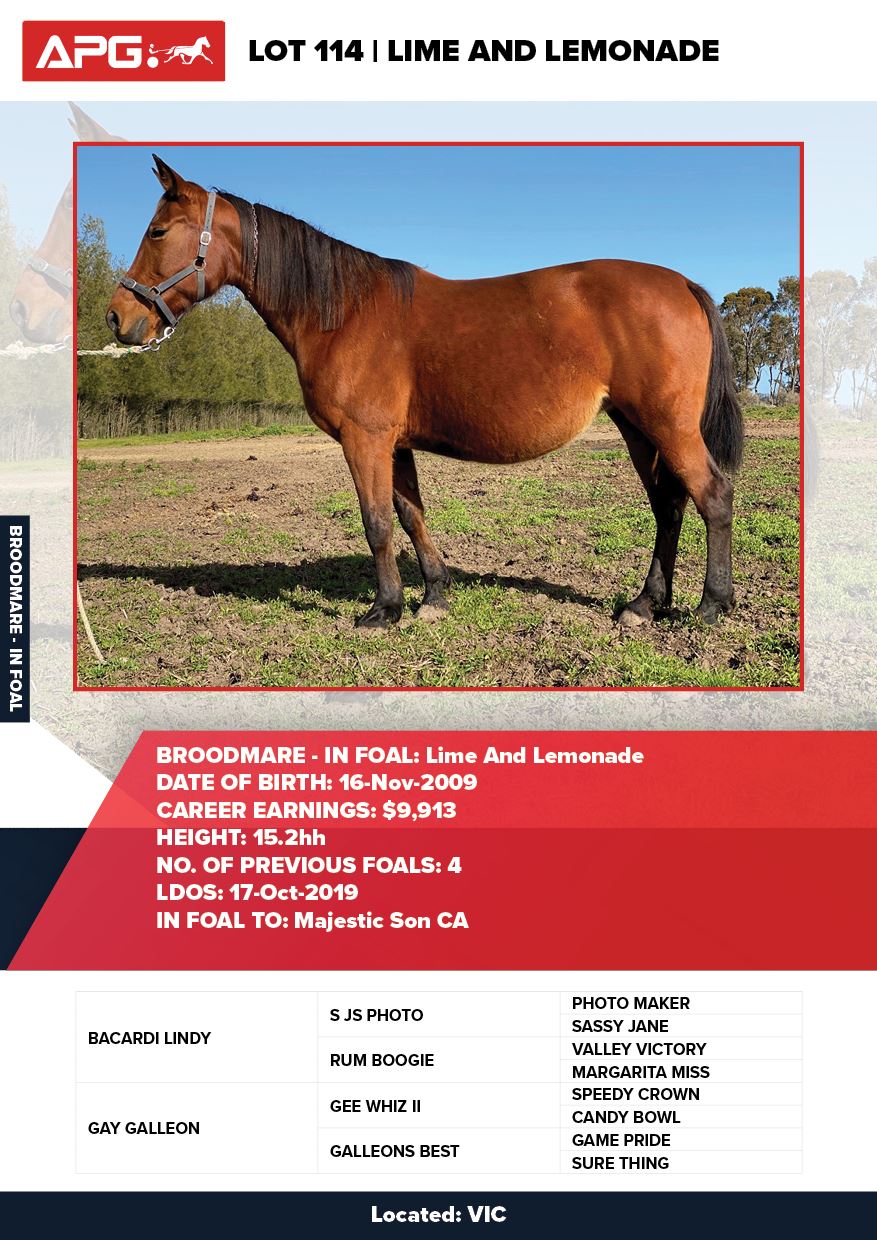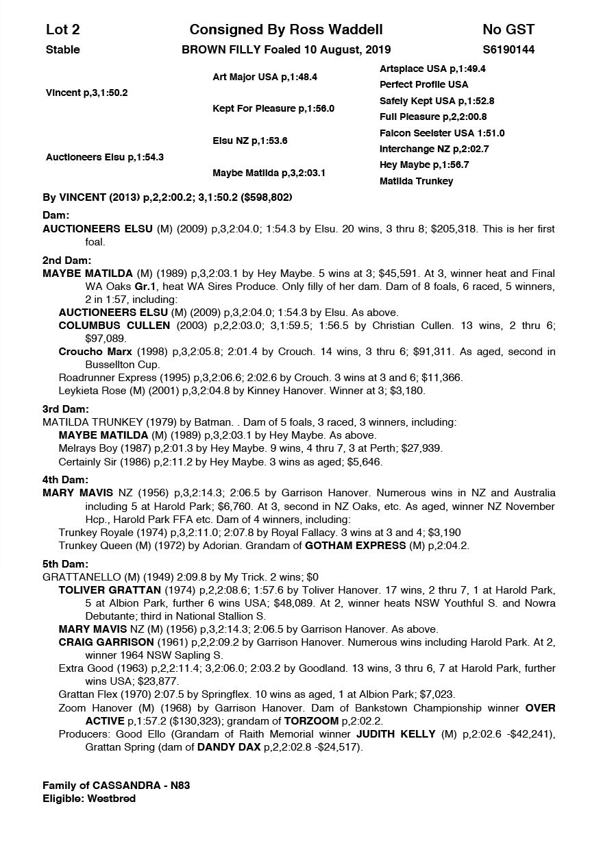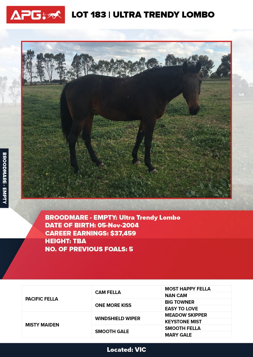 | Mare | Ultra Trendy Lombo | Pacific Fella USA | Misty Maiden | Jenny Gallagher & Garry Hawthorn | VIC | Yirribee Stud | $2,750 |