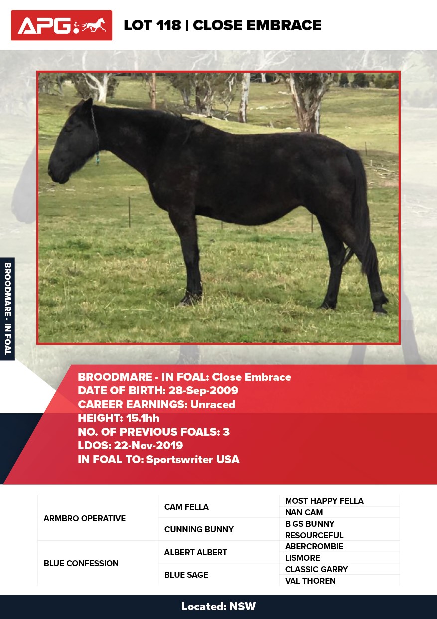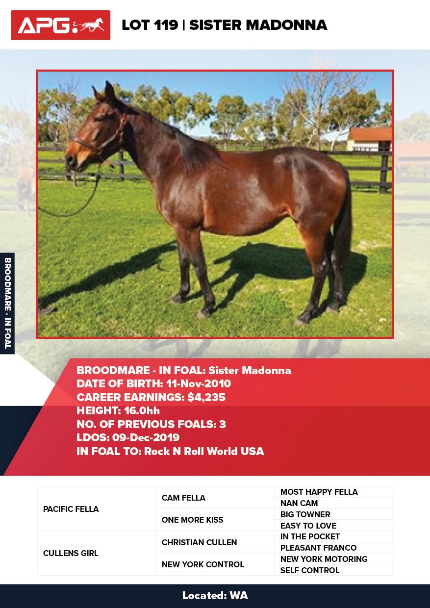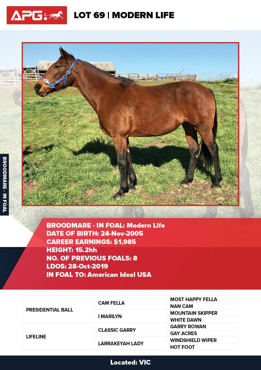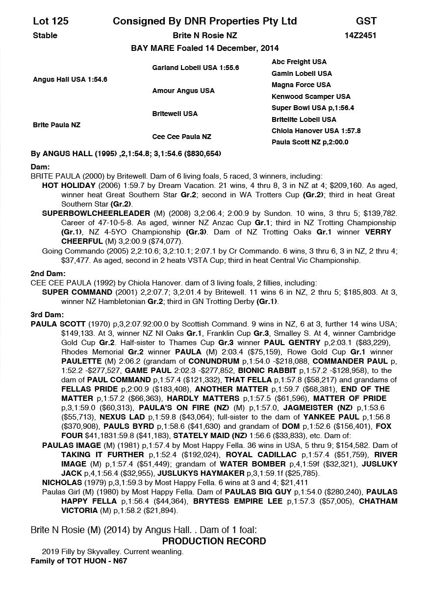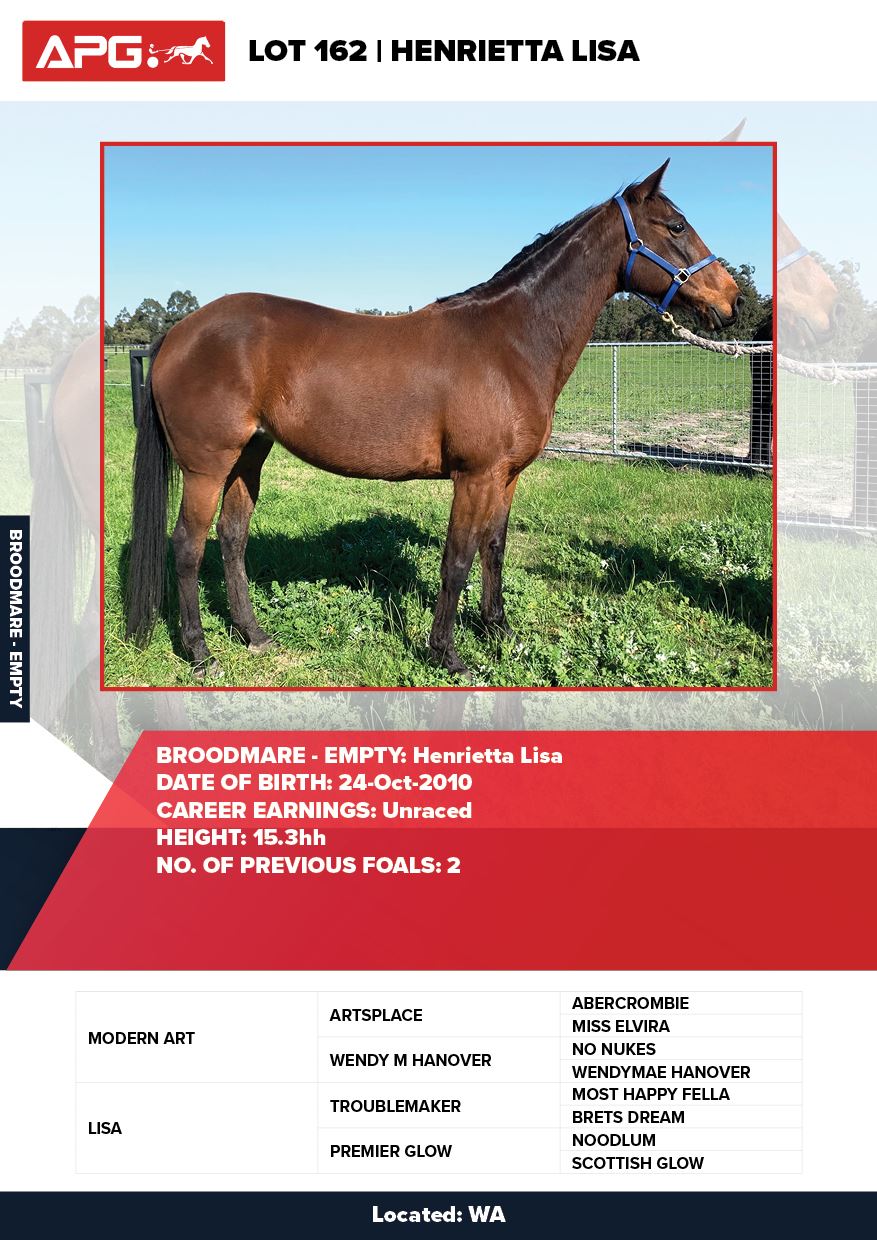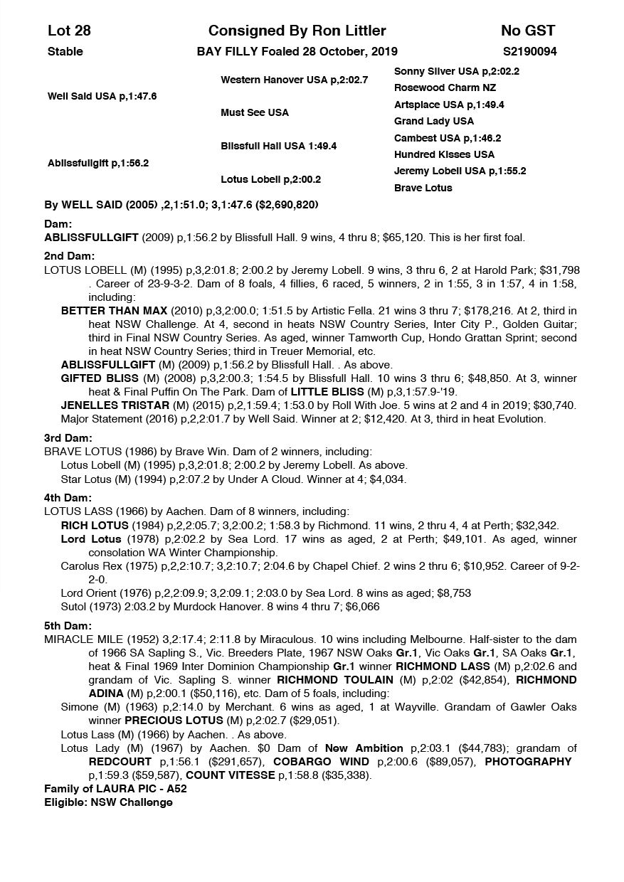 | Mare | Ultra Trendy Lombo | Pacific Fella USA | Misty Maiden | Jenny Gallagher & Garry Hawthorn | VIC | Yirribee Stud | $2,750 |