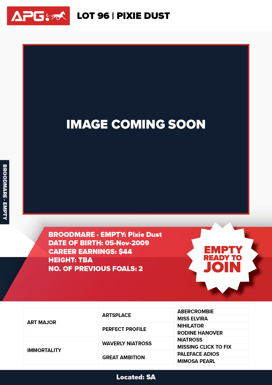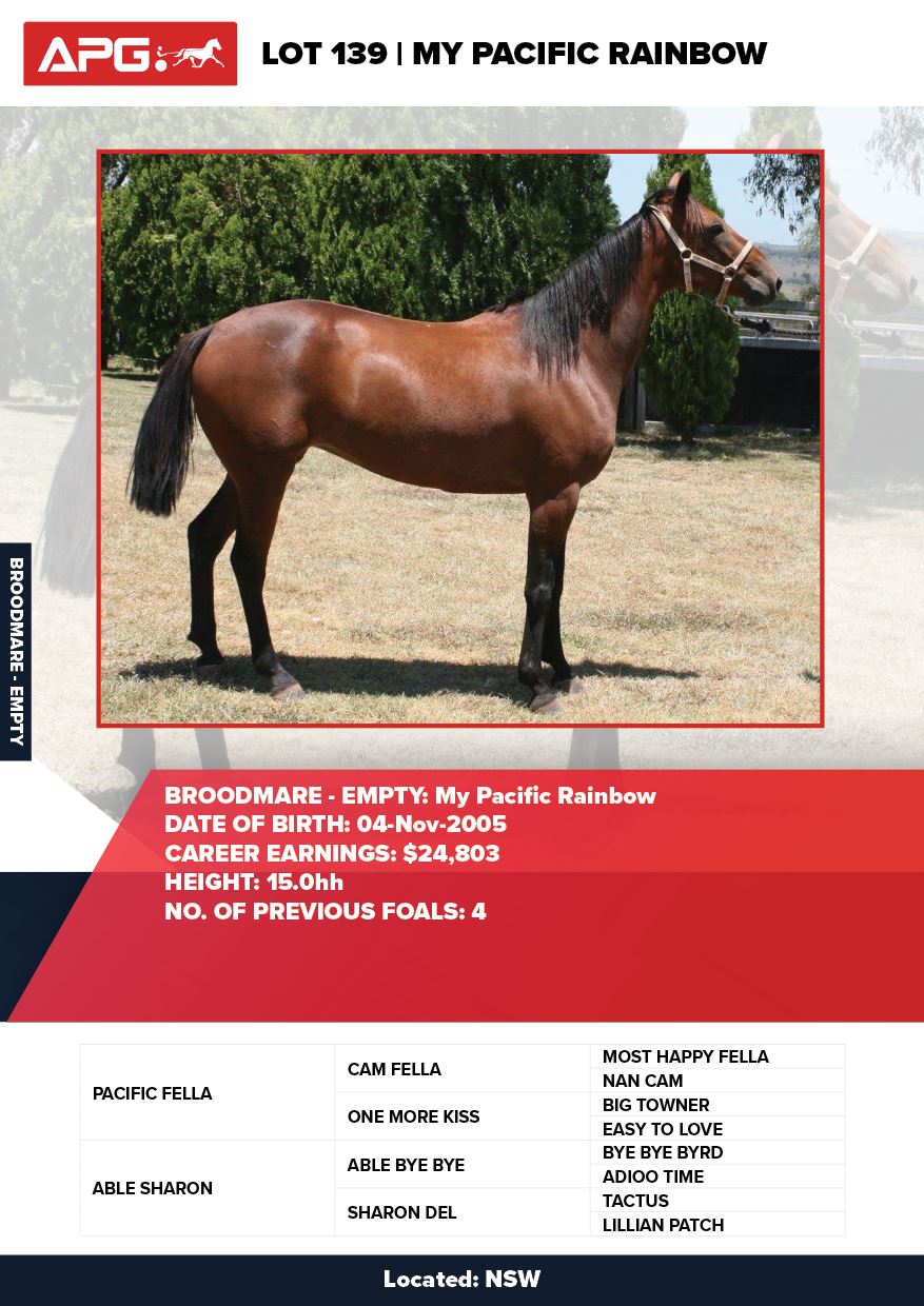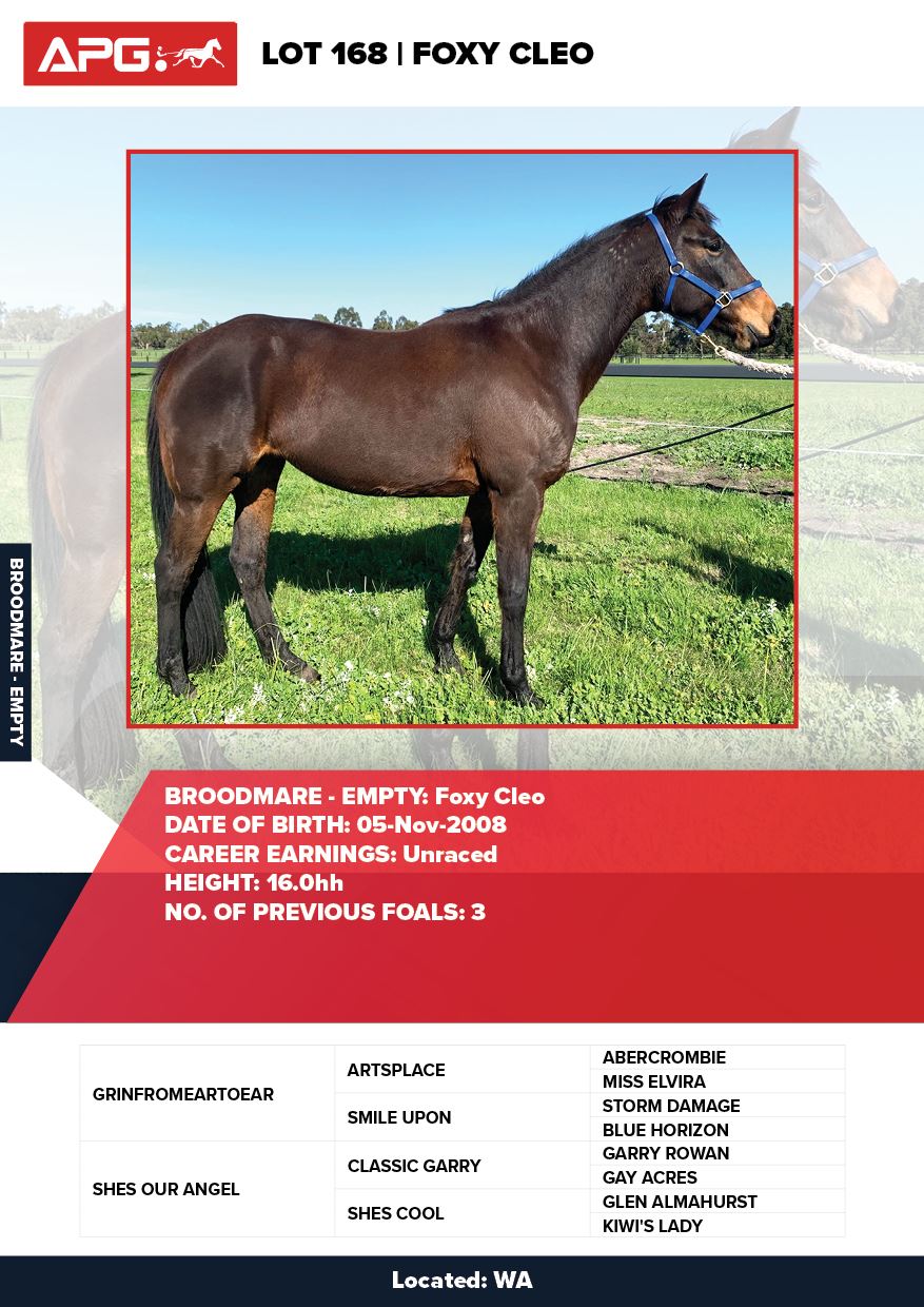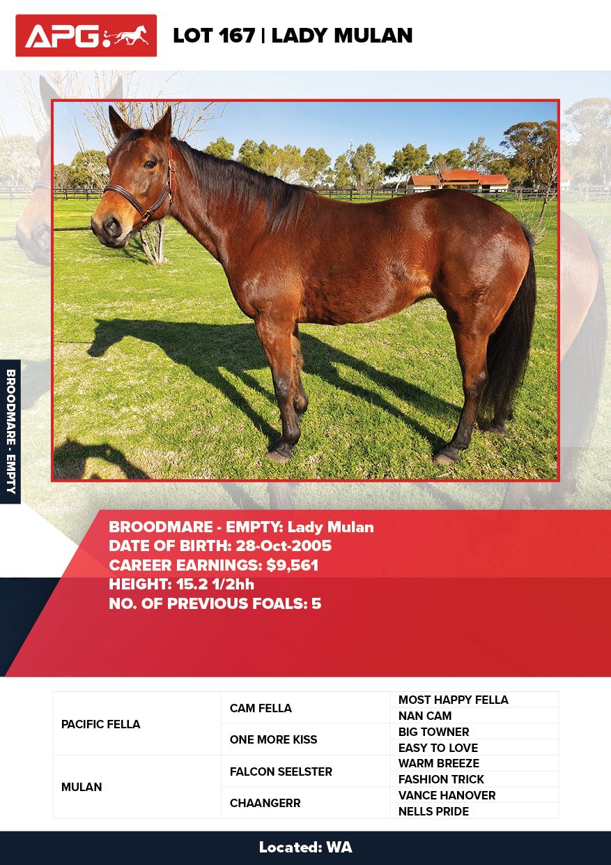 | Mare | Lady Mulan | Pacific Fella USA | Mulan | Allwood Stud | WA |