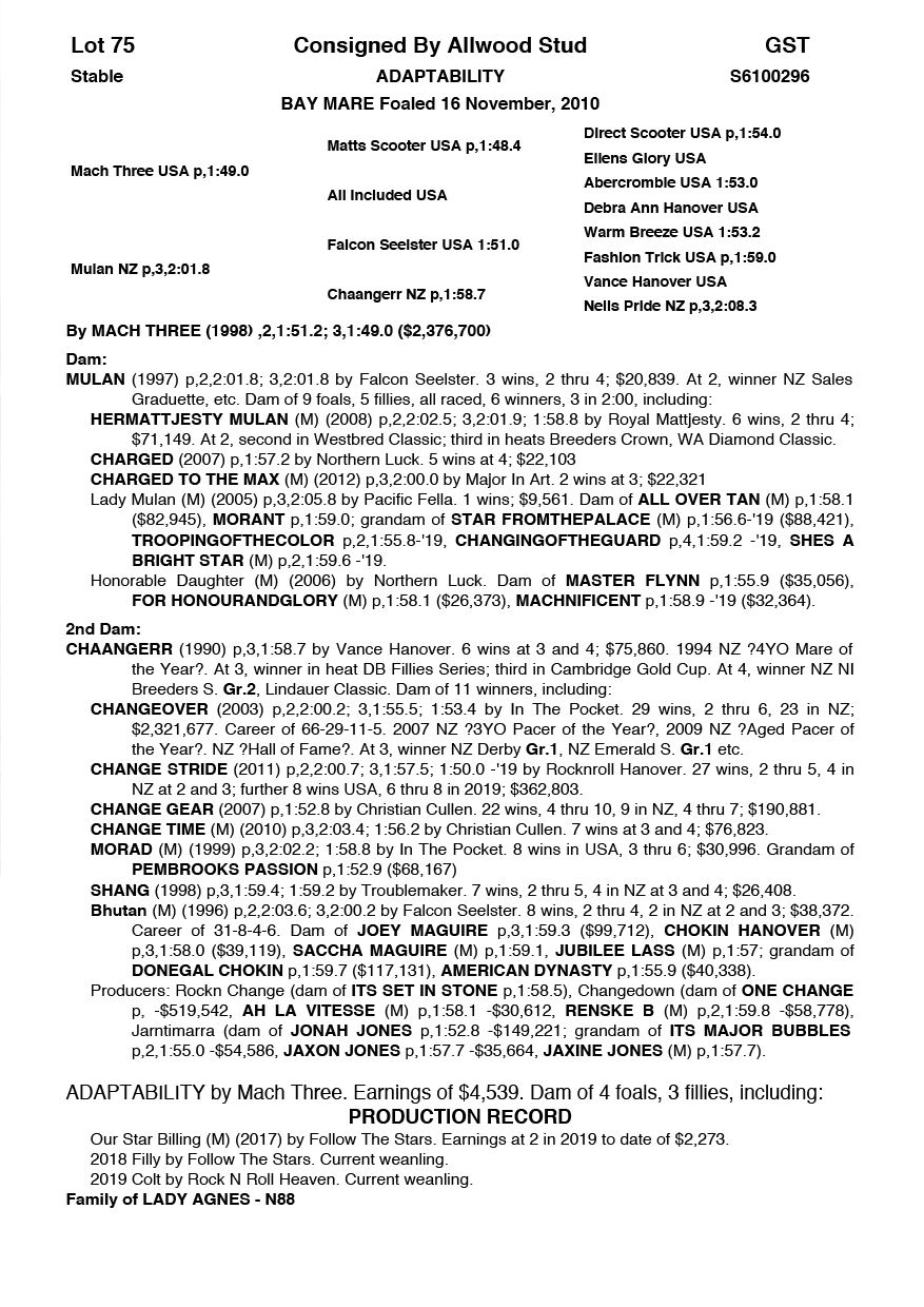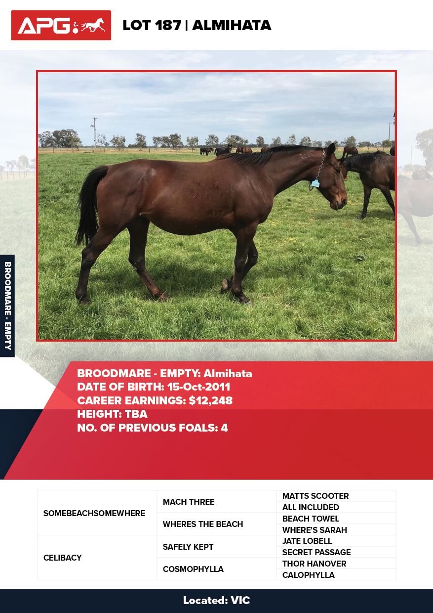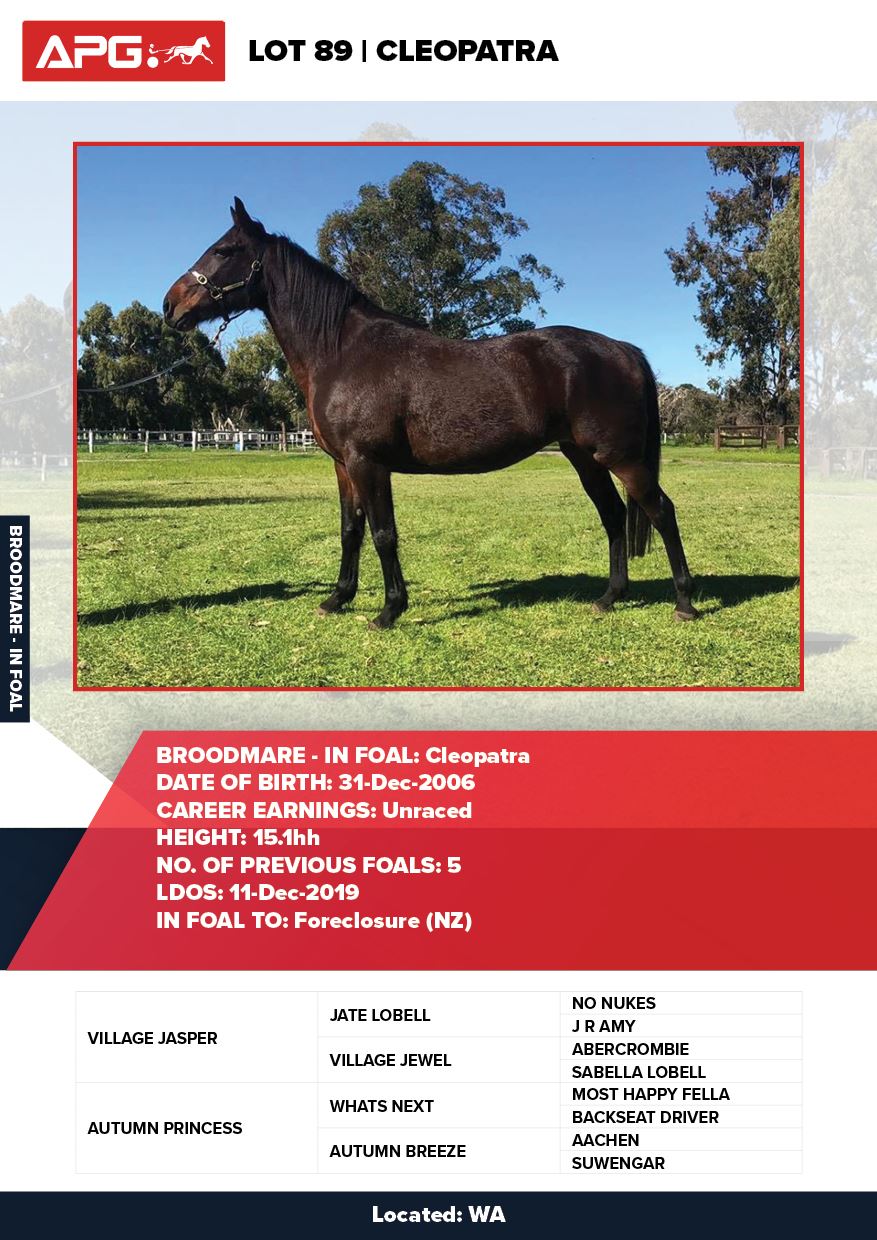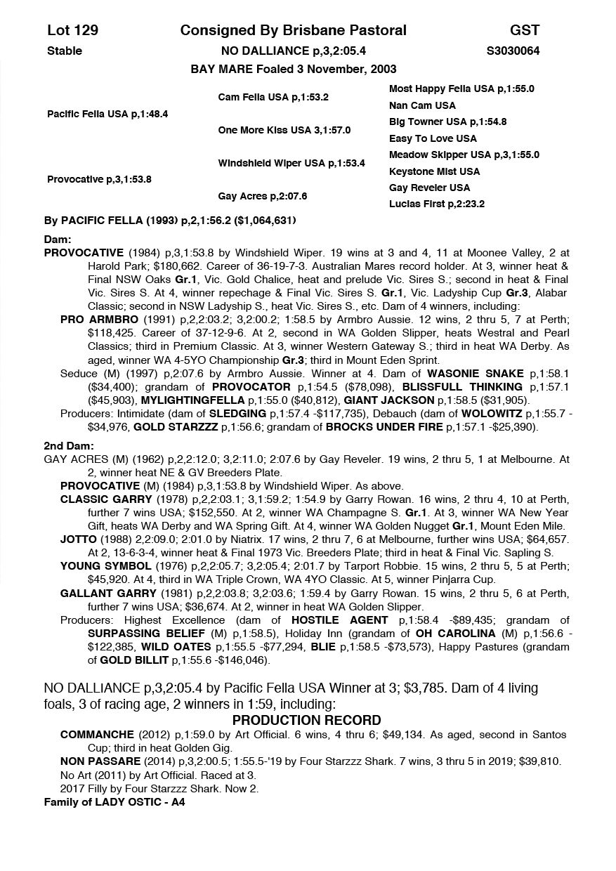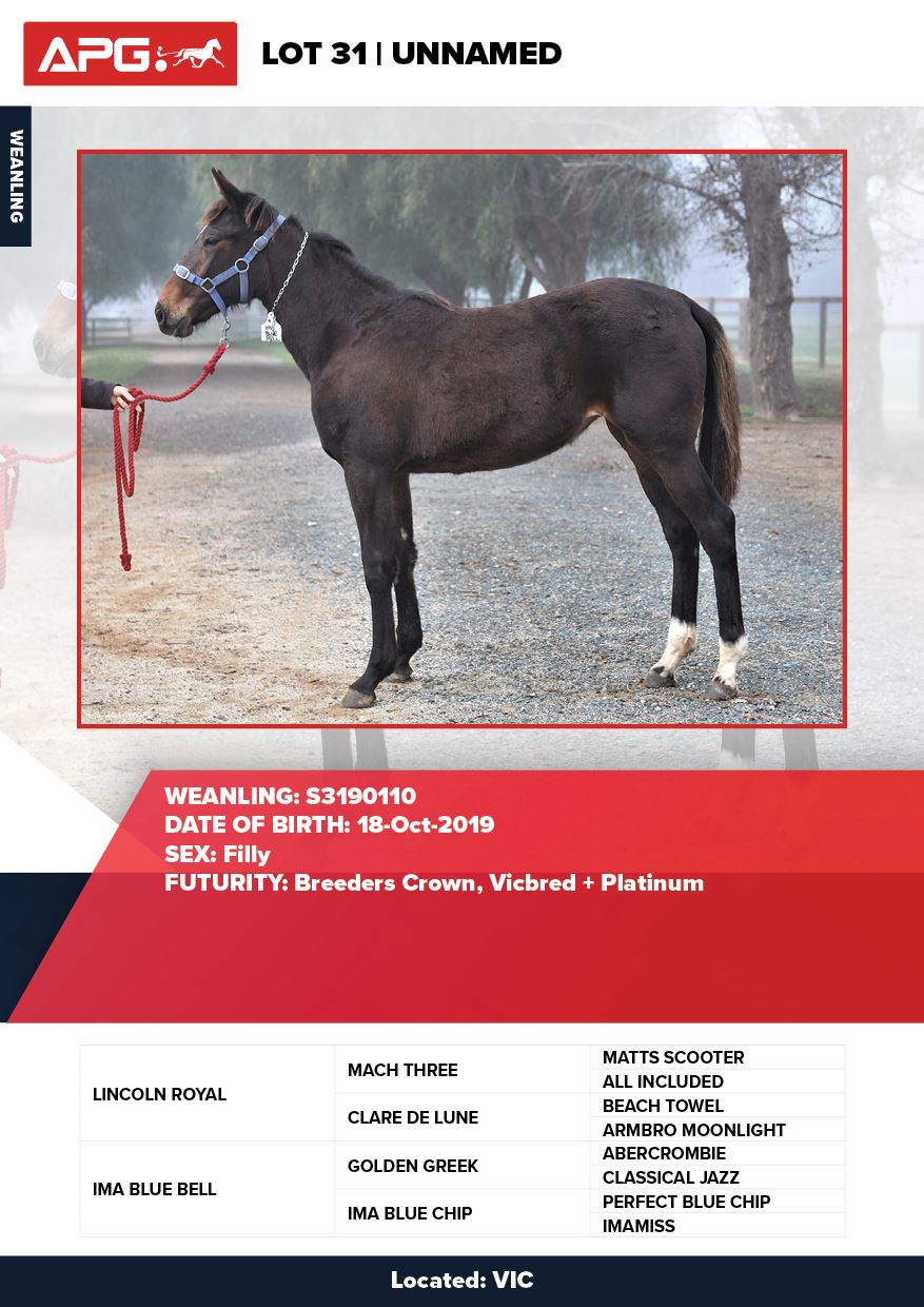 | Mare | Lady Mulan | Pacific Fella USA | Mulan | Allwood Stud | WA |