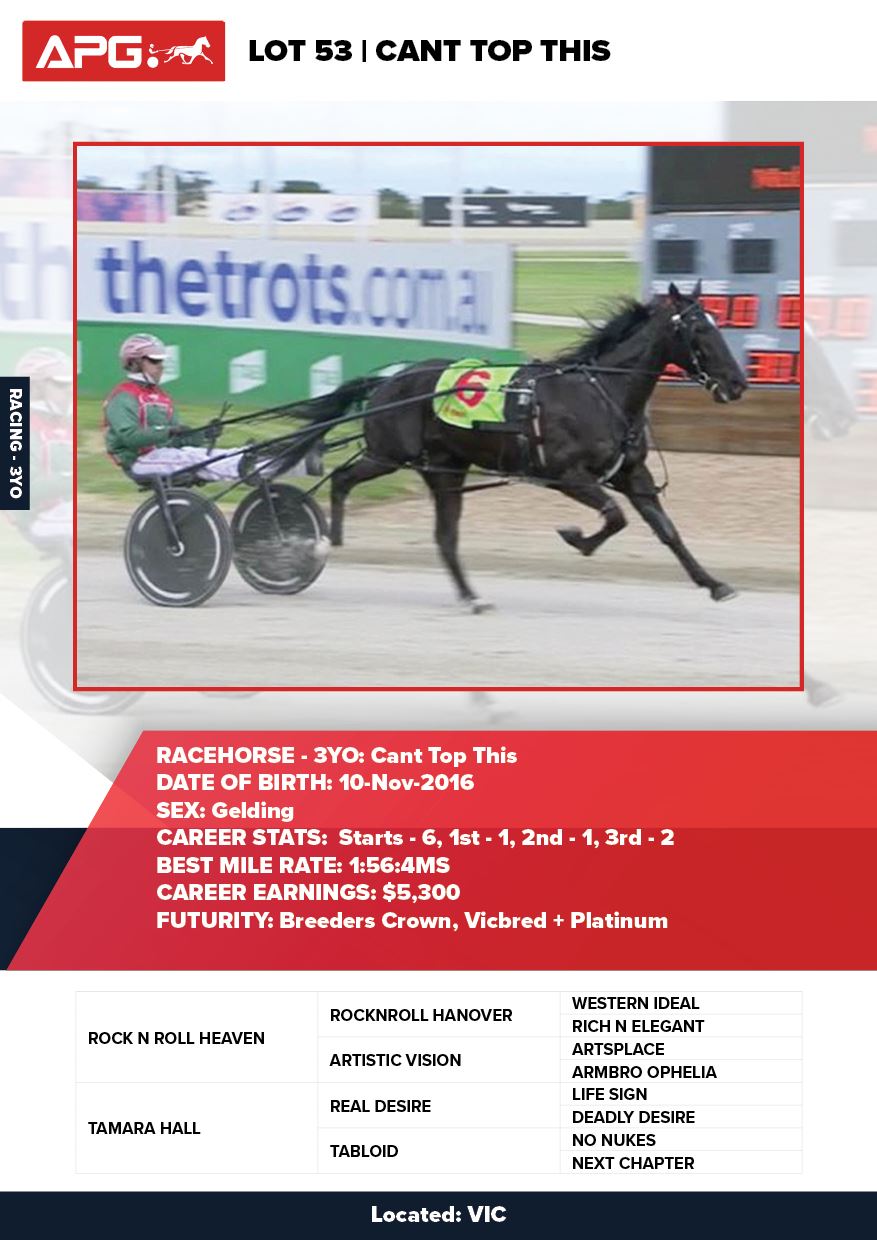 | Yankee Rockstar | Angel Of Music | Dunroamin Standardbreds | VIC | Glen Falzon | $4,000 |