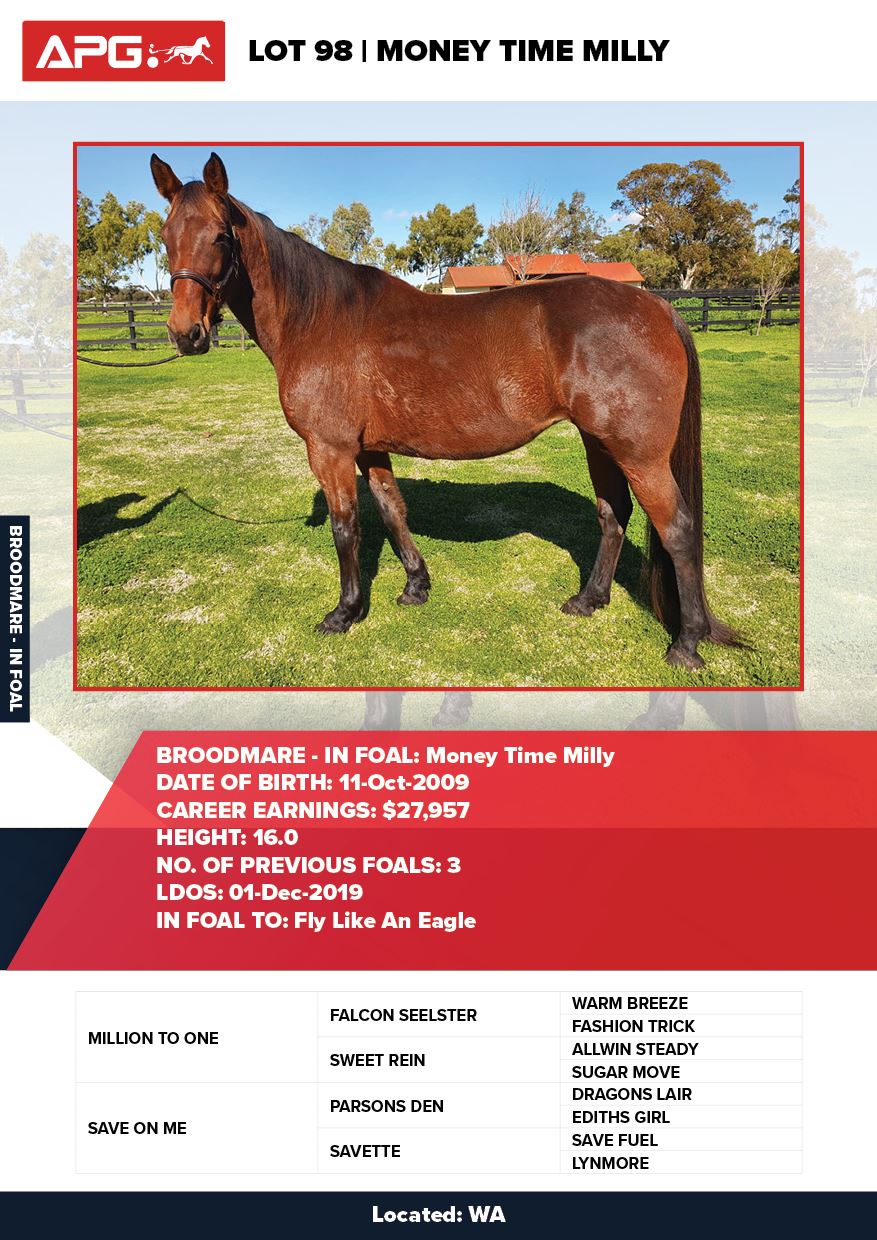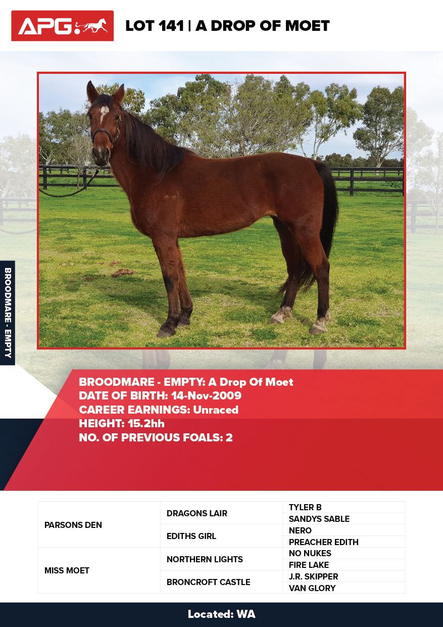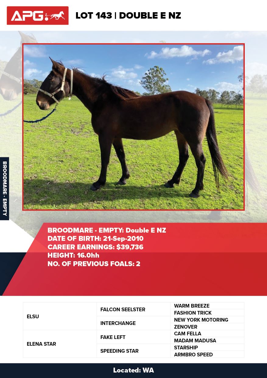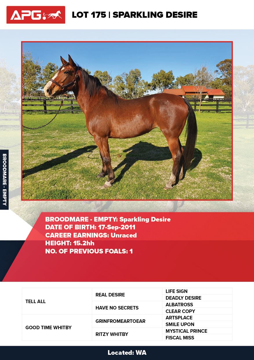 | Mare | Sparkling Desire | Tell All USA | Good Time Whitby | Allwood Stud | WA |