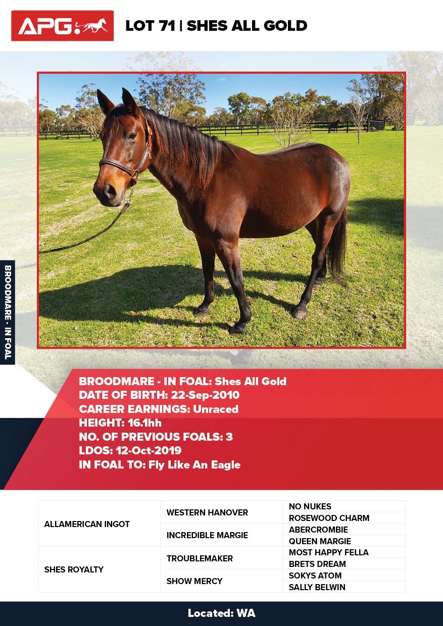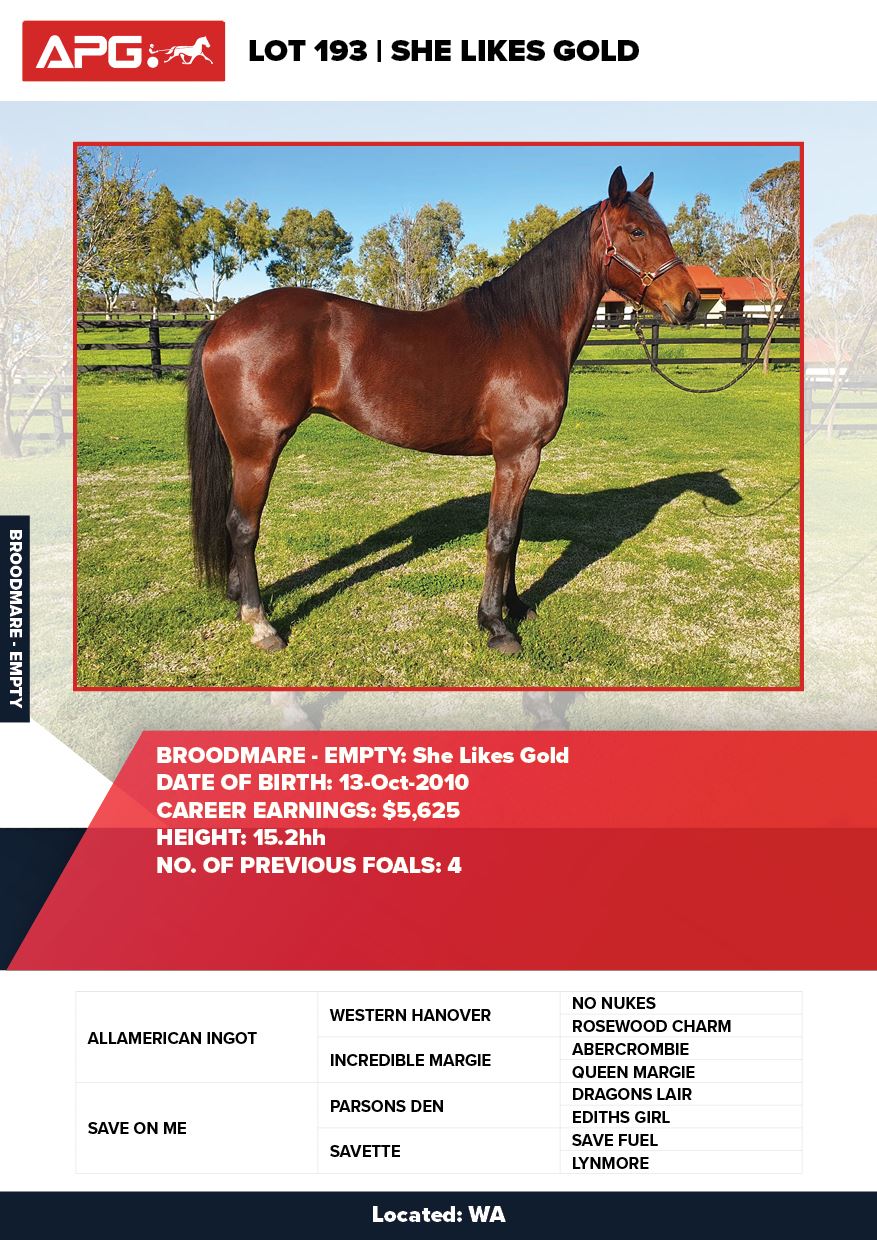 | Mare | She Likes Gold | Allamerican Ingot USA | Save On Me | Allwood Stud | WA |