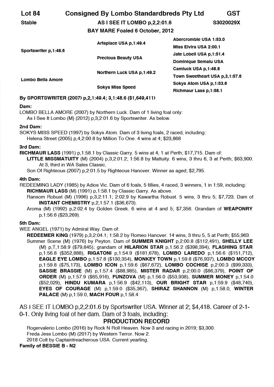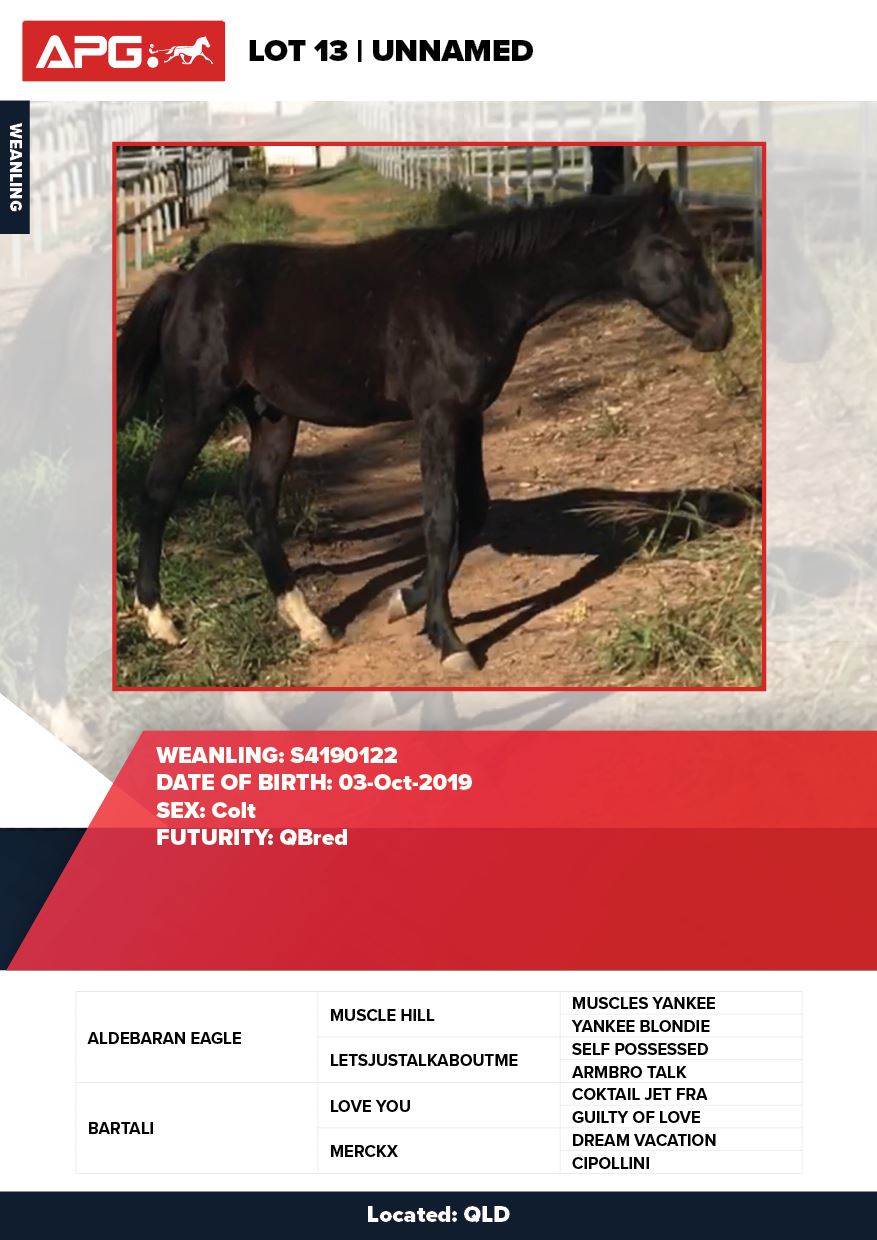 | Mare | Quick Draw Lombo | Modern Art USA | Lombo Rapida | Brisbane Pastoral | QLD | Lance Cobban | $600 |
