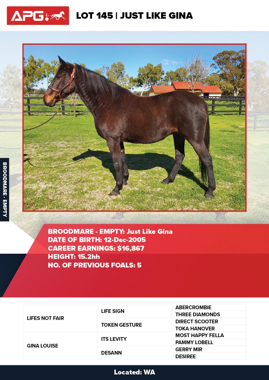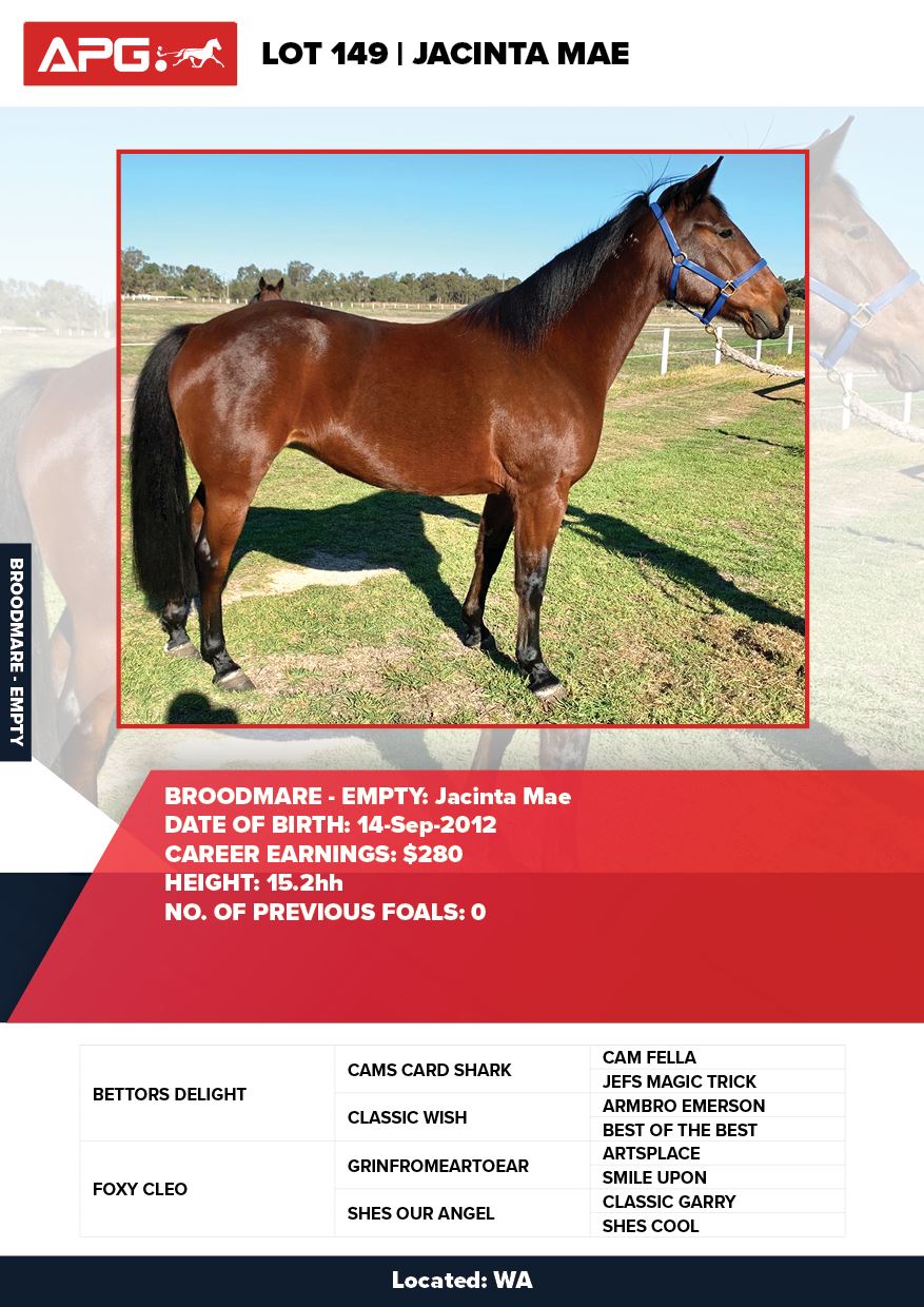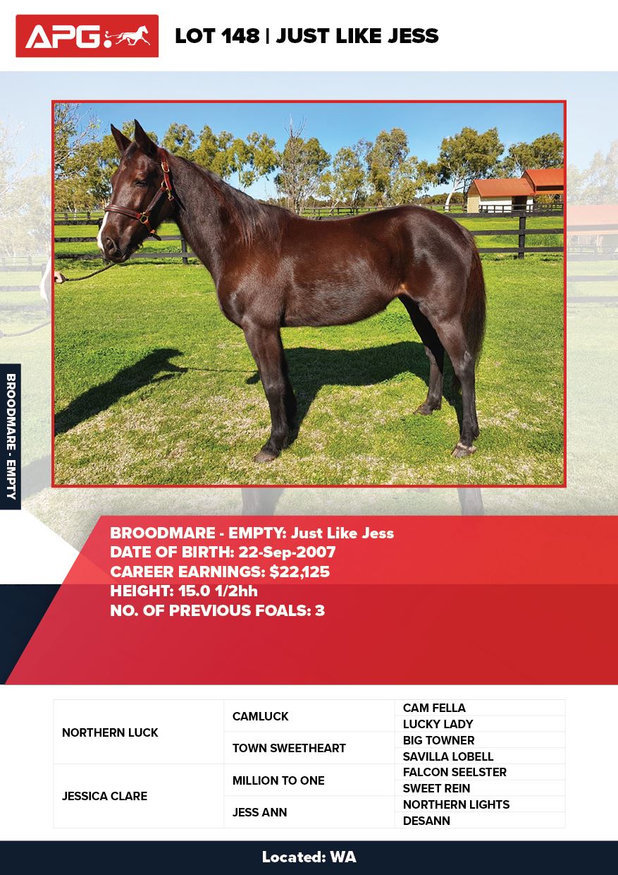 | Mare | Just Like Jess | Northern Luck USA | Jessica Clare | Allwood Stud | WA |