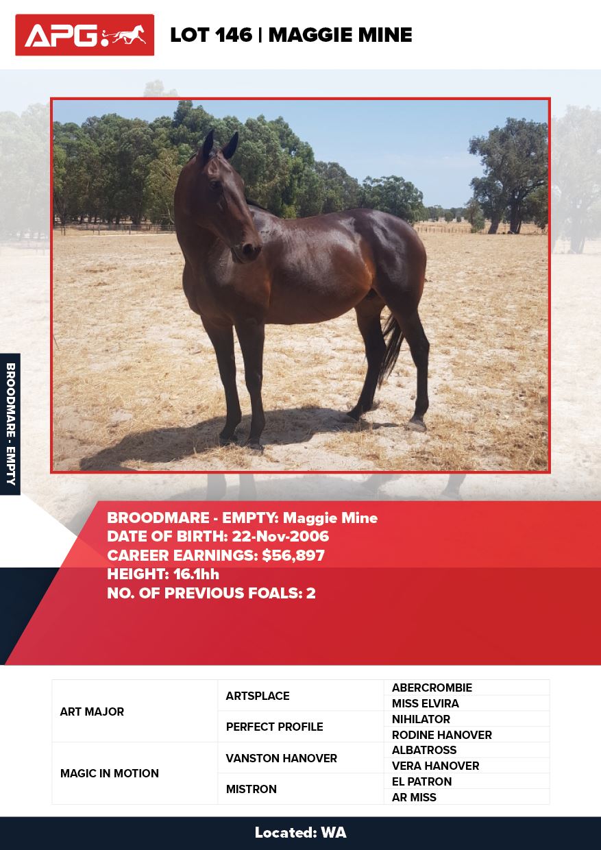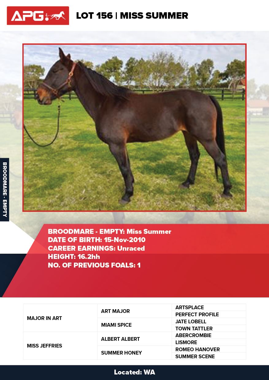 | Mare | Miss Summer | Major In Art USA | Miss Jeffries | Allwood Stud | WA |