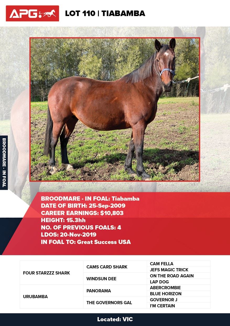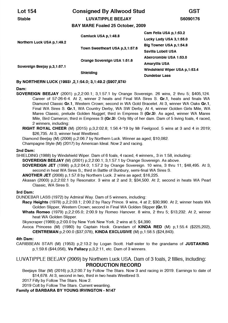| Mare | Luvatipple Beejay | Northern Luck USA | Sovereign Beejay | Allwood Stud | WA |