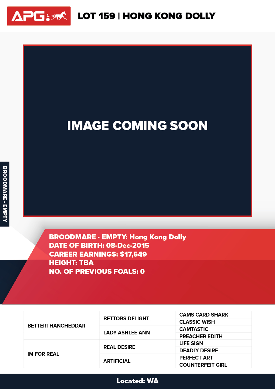 | Mare | Hong Kong Dolly | Betterthancheddar USA | Im For Real | Pacing WA | WA | John Paikos | $1,750 |