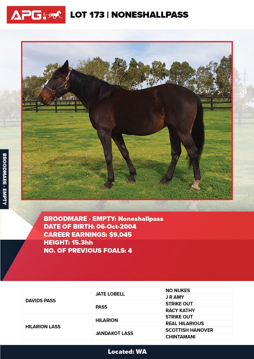 | Mare | Noneshallpass | Davids Pass USA | Hilarion Lass | Allwood Stud | WA |