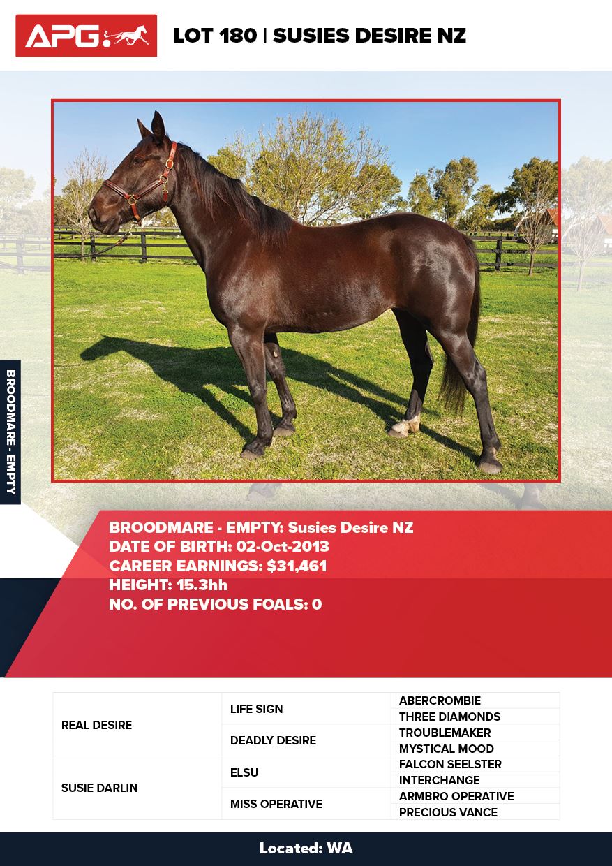 | Mare | Susies Desire NZ | Real Desire USA | Susie Darlin (NZ) | Allwood Stud | WA |