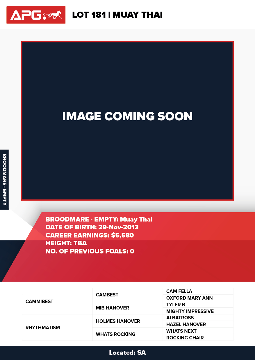 | Mare | Muay Thai | Cammibest USA | Rhythmatism | Wyndown Stud | SA | Loone, Shane | $500 |