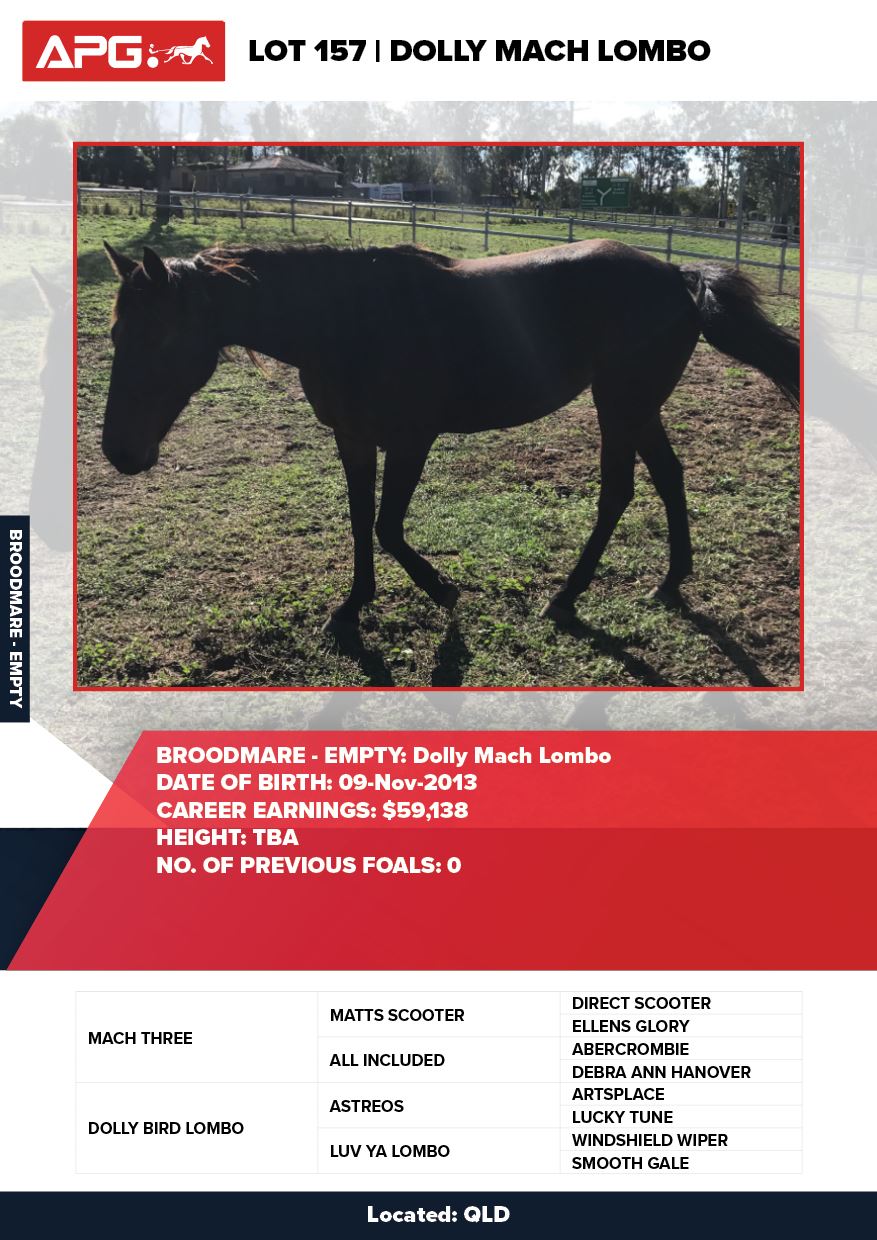 | Mare | Dolly Mach Lombo | Mach Three CA | Dolly Bird Lombo | Veivers Purchases Pty Ltd | QLD | Monarch Farm | $1,750 |