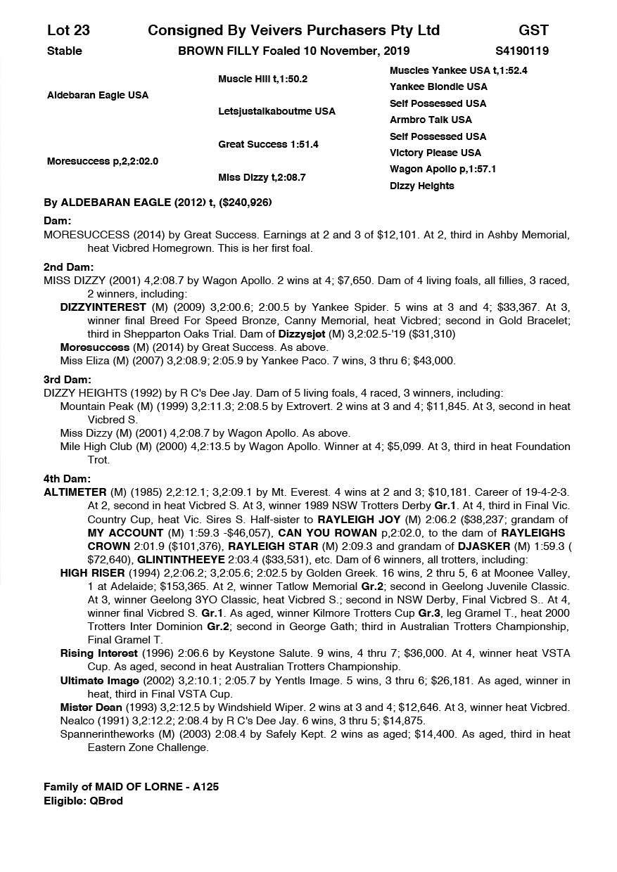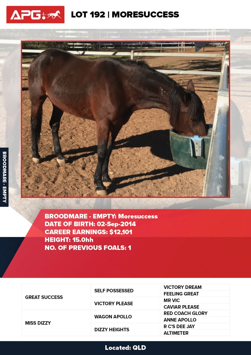 | Mare | Moresuccess | Great Success USA | Miss Dizzy | Veivers Purchases Pty Ltd | QLD | Knox, Colin | $350 |