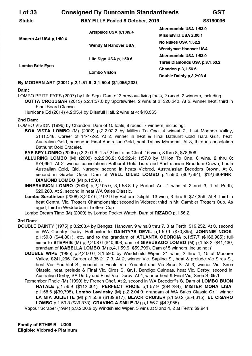 | Modern Art USA | Lombo Brite Eyes | Dunroamin Standardbreds | VIC | Glenn Holland | $7,000 |