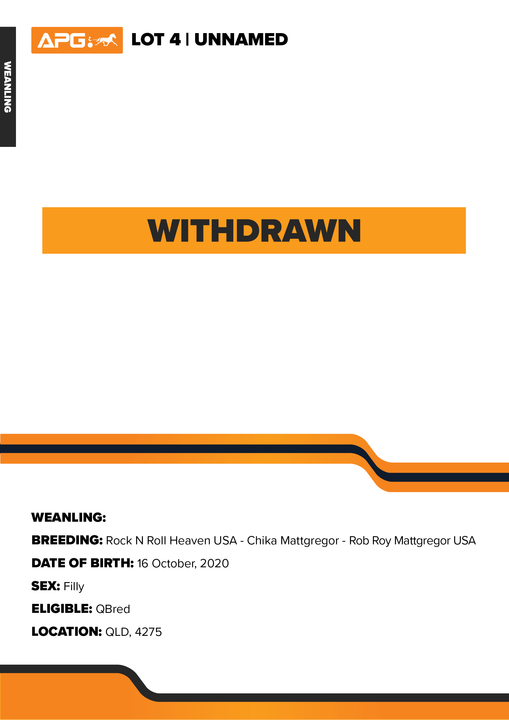 | Filly | Unnamed | Rock N Roll Heaven USA | Chika Mattgregor | Brisbane Pastoral Company Pty Ltd |