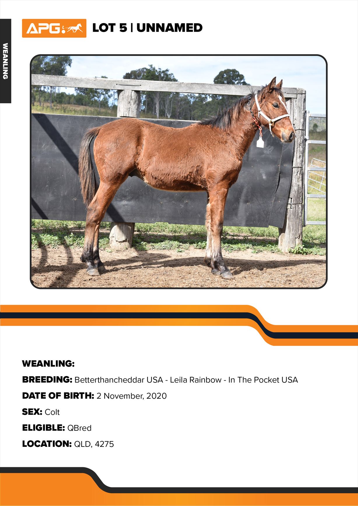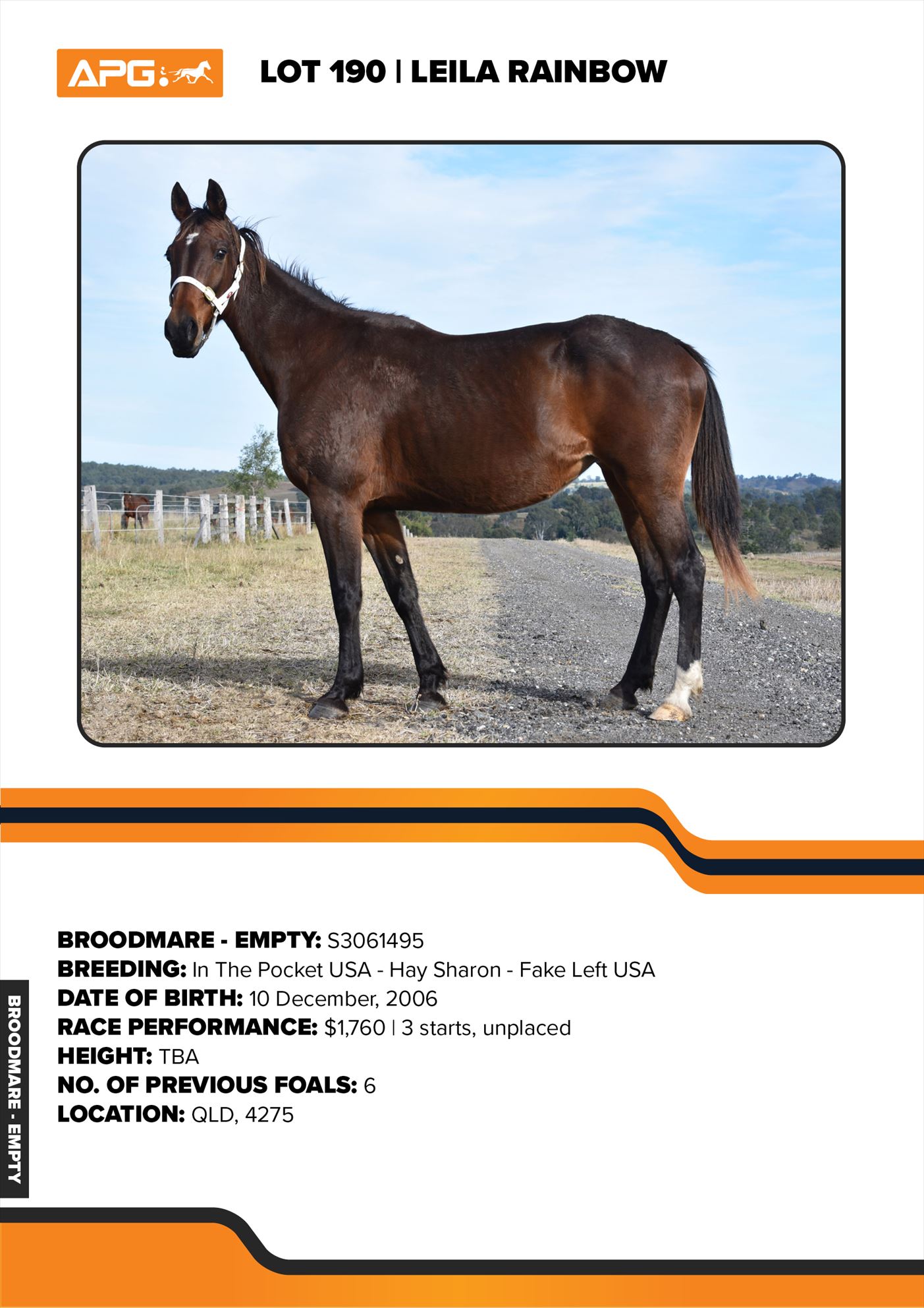 | Mare | Leila Rainbow | In The Pocket USA | Hay Sharon | Brisbane Pastoral Company Pty Ltd | QLD, 4275 | Ray Davis | $700 |