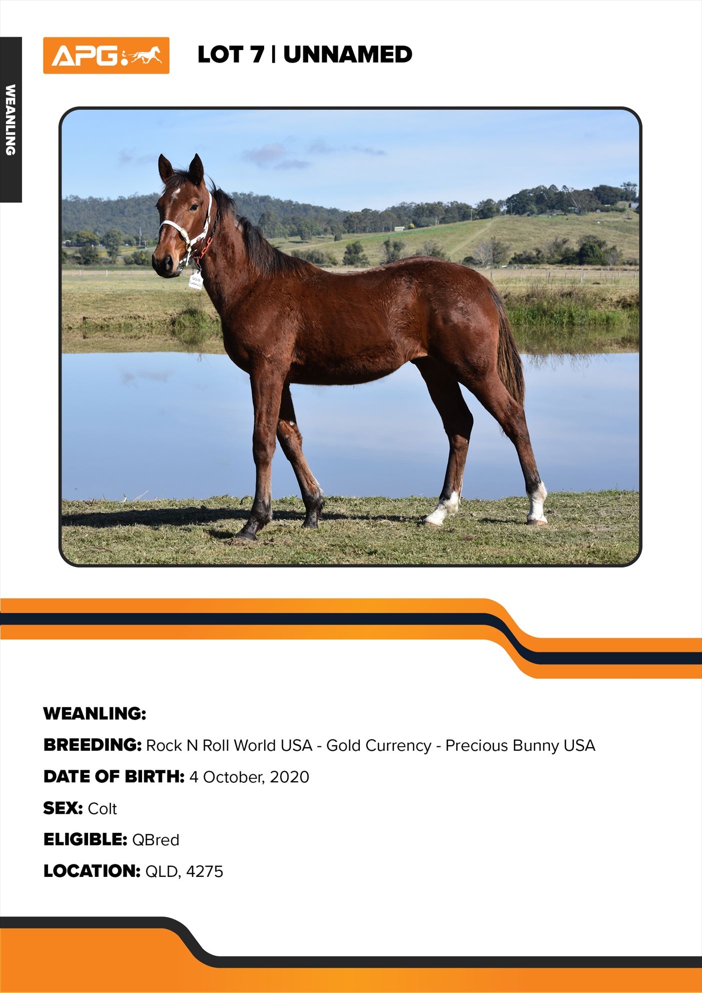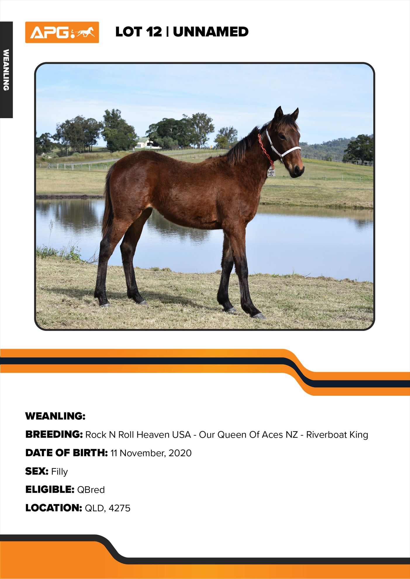 | Filly | Hell Of A Hand | Rock N Roll Heaven USA | Our Queen Of Aces NZ | Brisbane Pastoral Company Pty Ltd | QLD, 4275 | Burwood Stud | $7,500 |