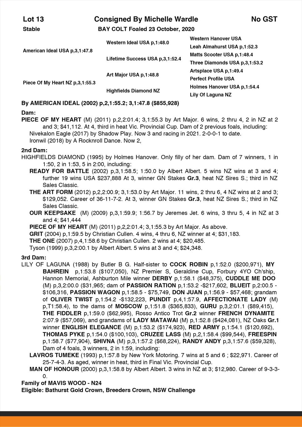 | American Ideal USA | Piece Of My Heart NZ | Michelle & Grahame Wardle | NSW, 2753 | Maurice Rolfe | $12,000 |