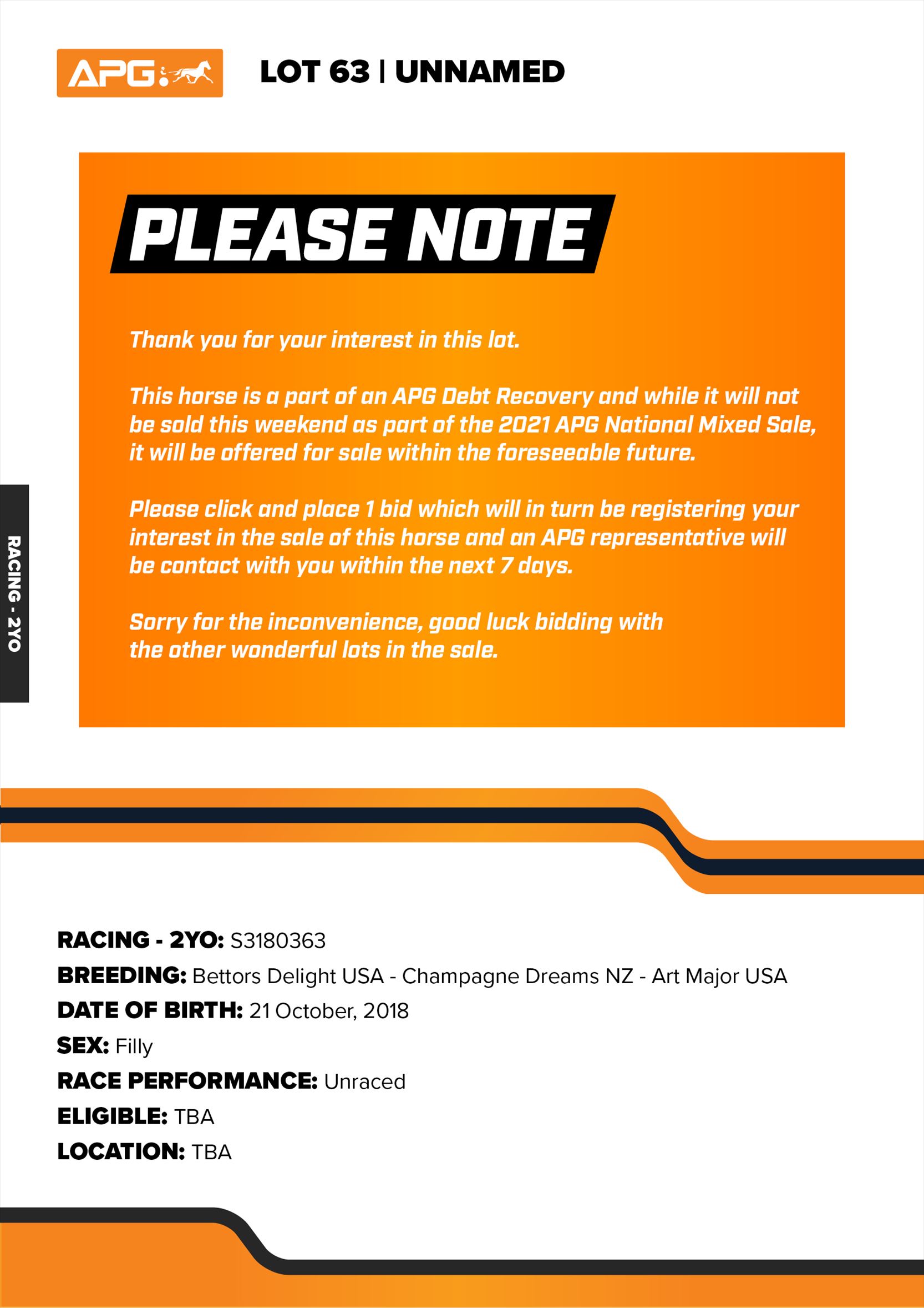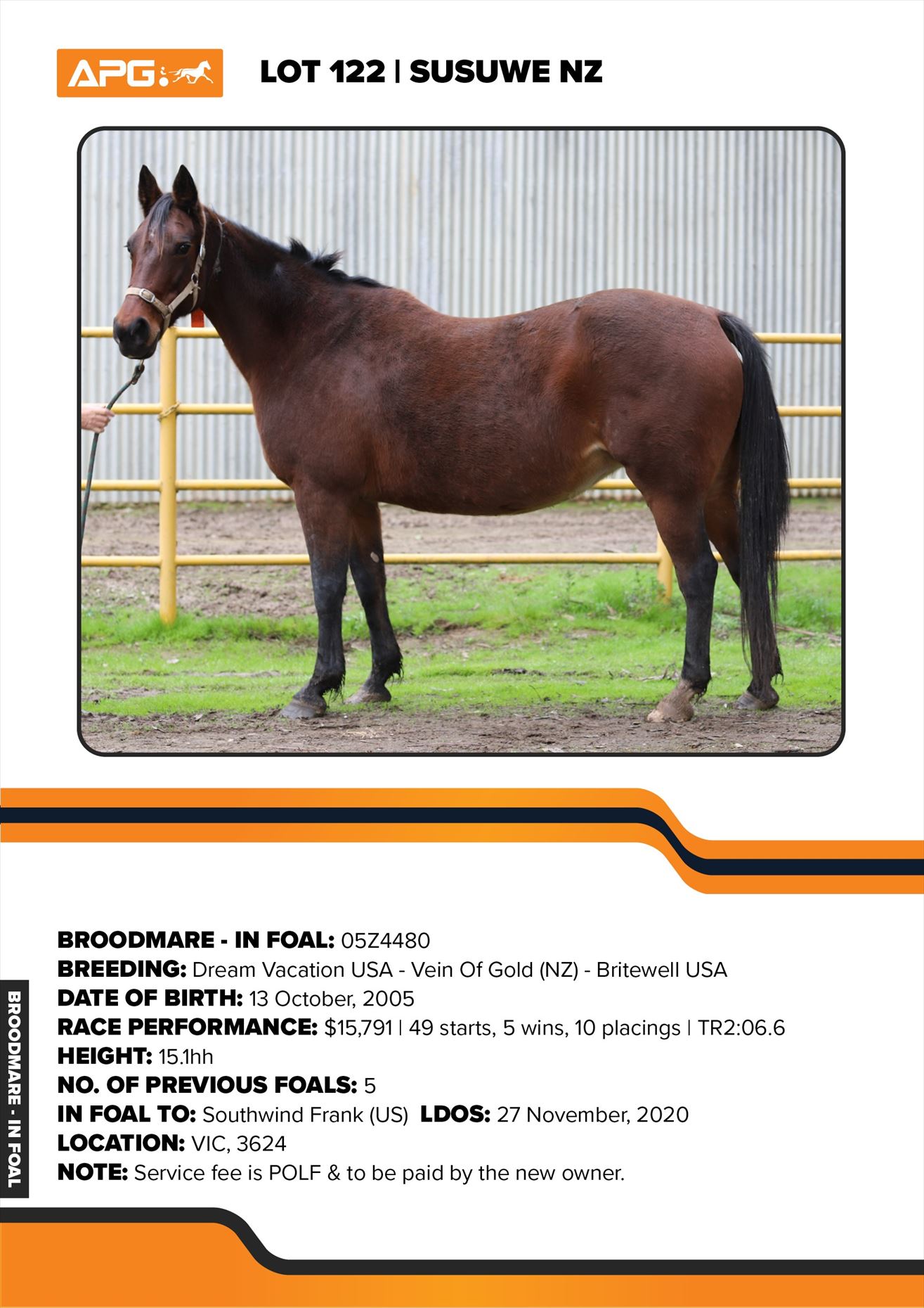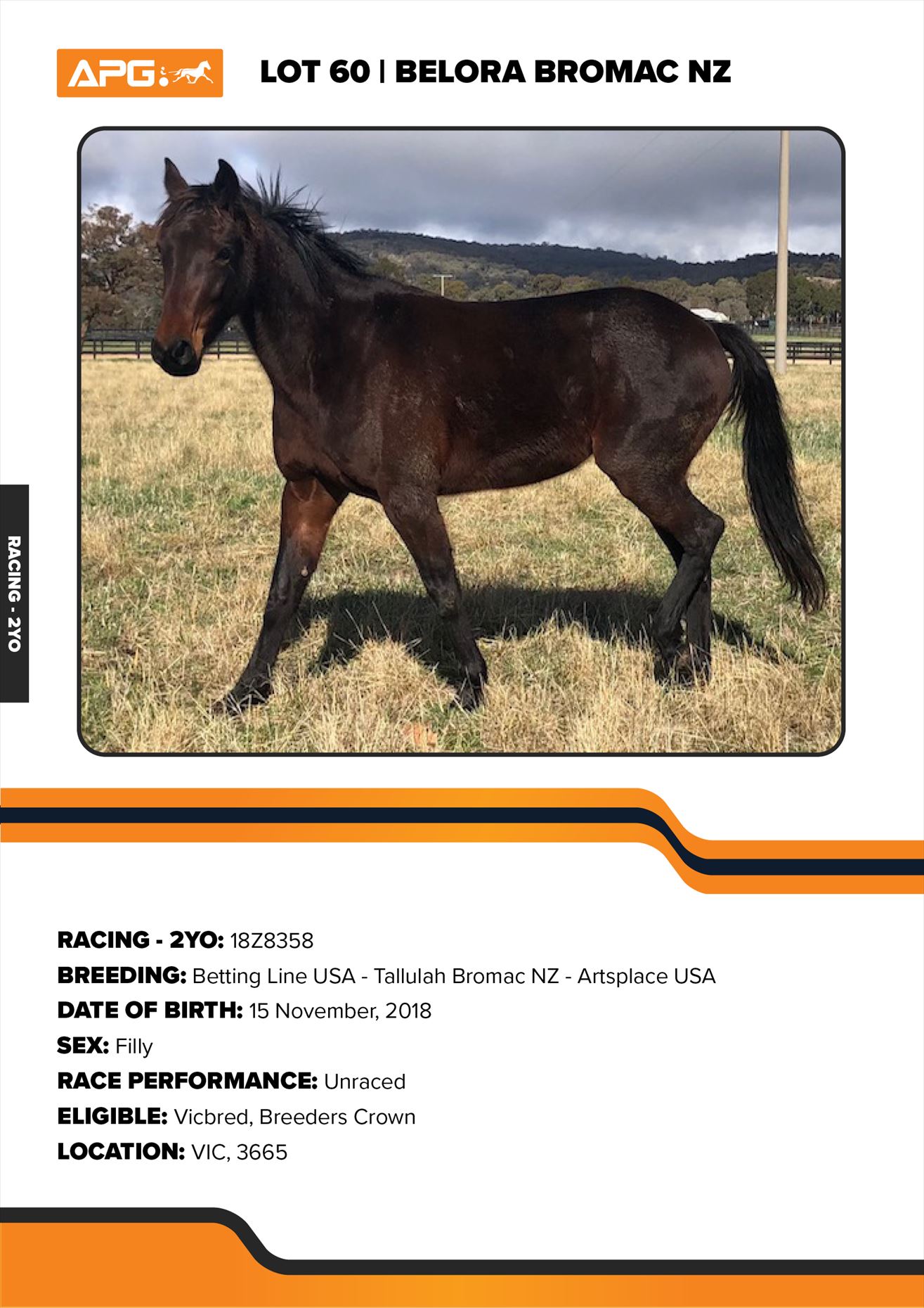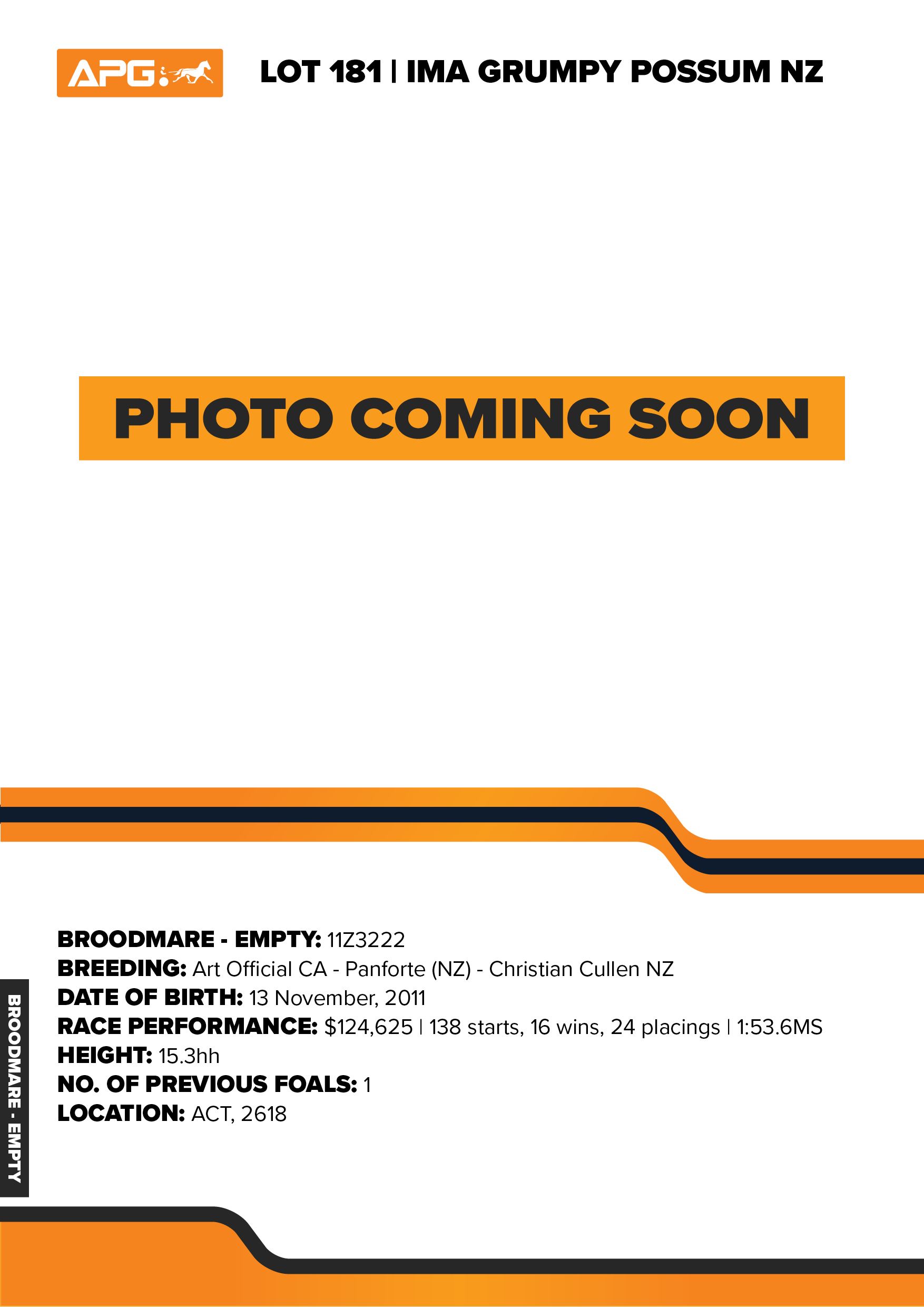 | Mare | Ima Grumpy Possum NZ | Art Official CA | Panforte (NZ) | Donald Spedding & Maryann Harris | ACT, 2618 | APG As Agent | $2,500 |