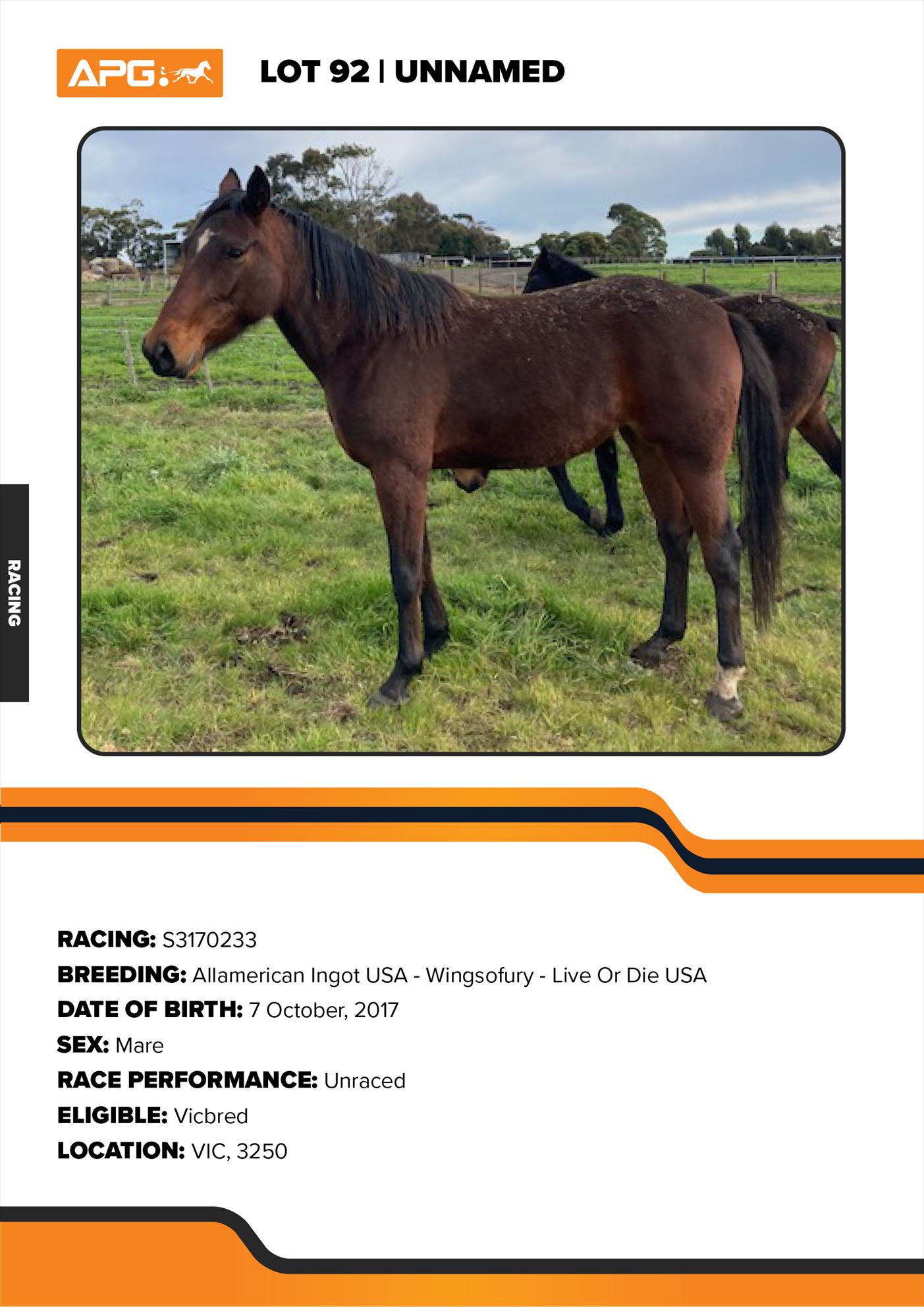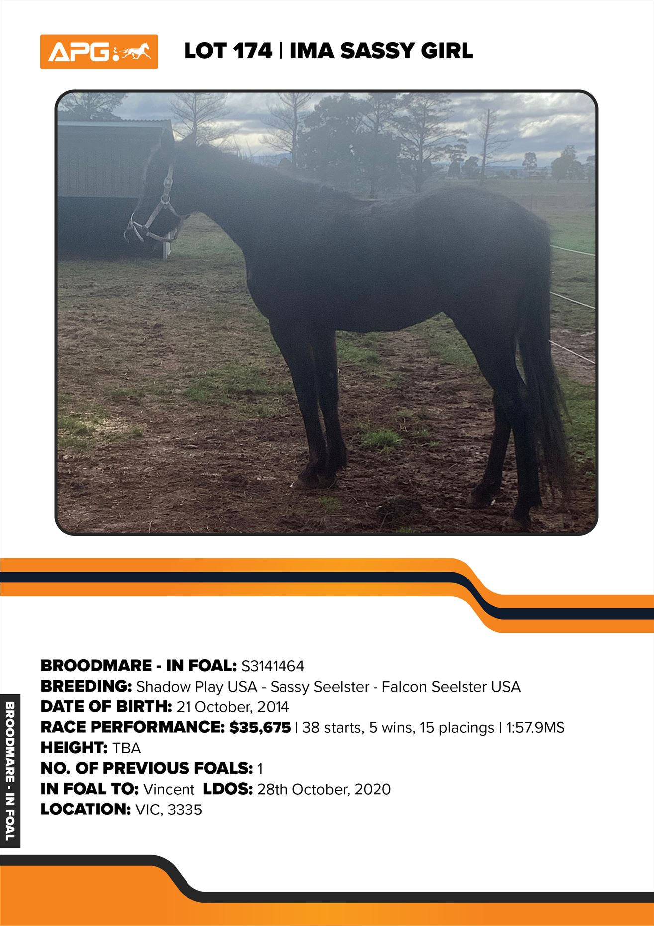 | Mare(+) | Ima Sassy Girl | Shadow Play USA | Sassy Seelster | Ted Caruana | VIC, 3335 | Paul Symes | $4,250 |