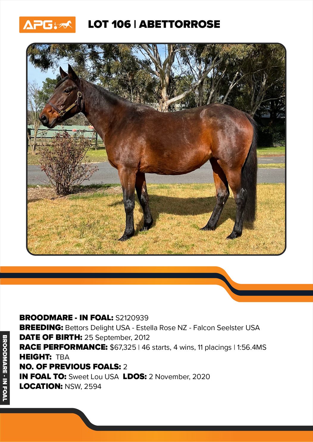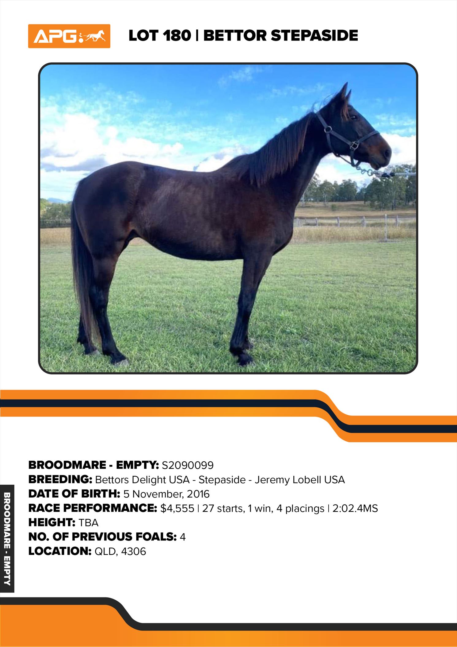 | Mare | Bettor Stepaside | Bettors Delight USA | Stepaside | John & Lesley O'Sullivan | QLD, 4401 |