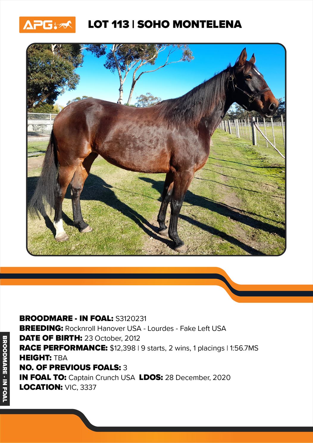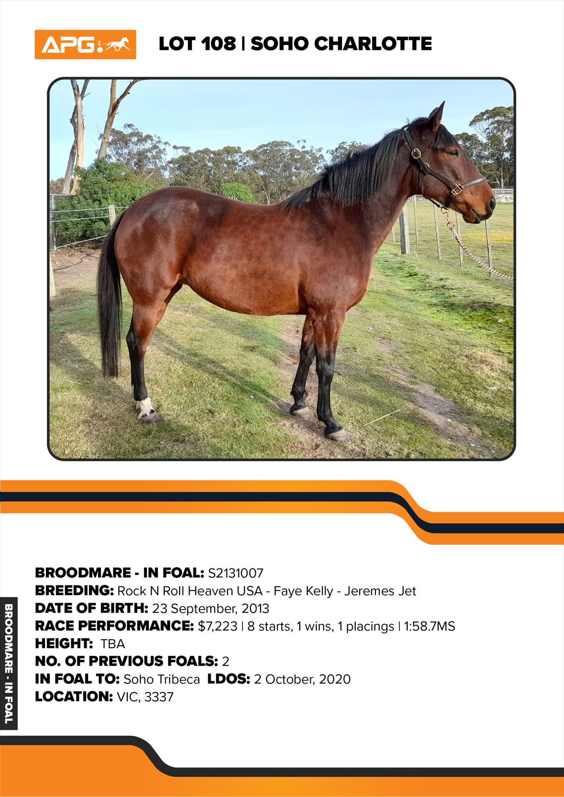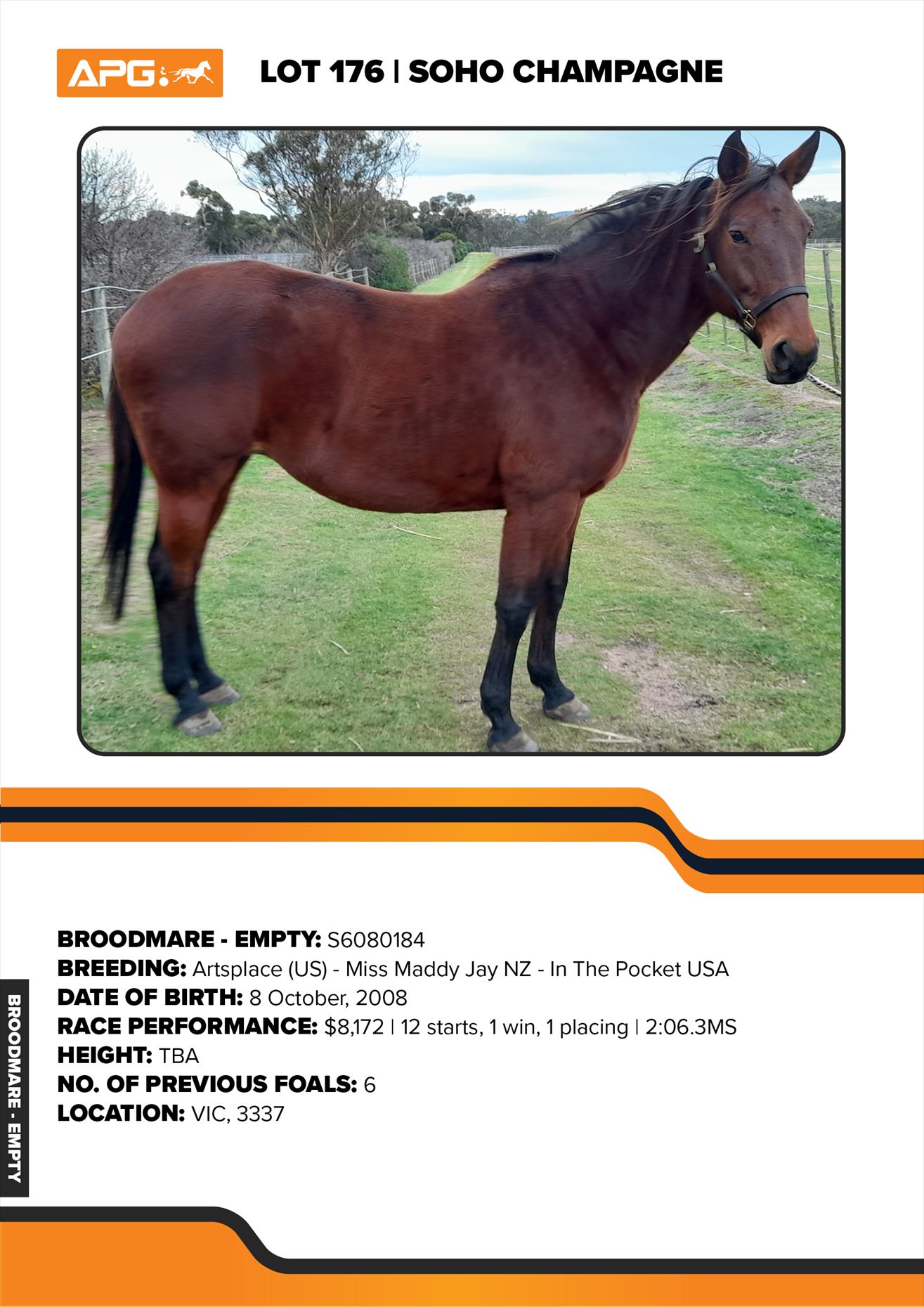 | Mare | Soho Champagne | Artsplace (US) | Miss Maddy Jay NZ | Soho Standardbreds | VIC, 3337 | Highfield Farm P/L | $7,500 |