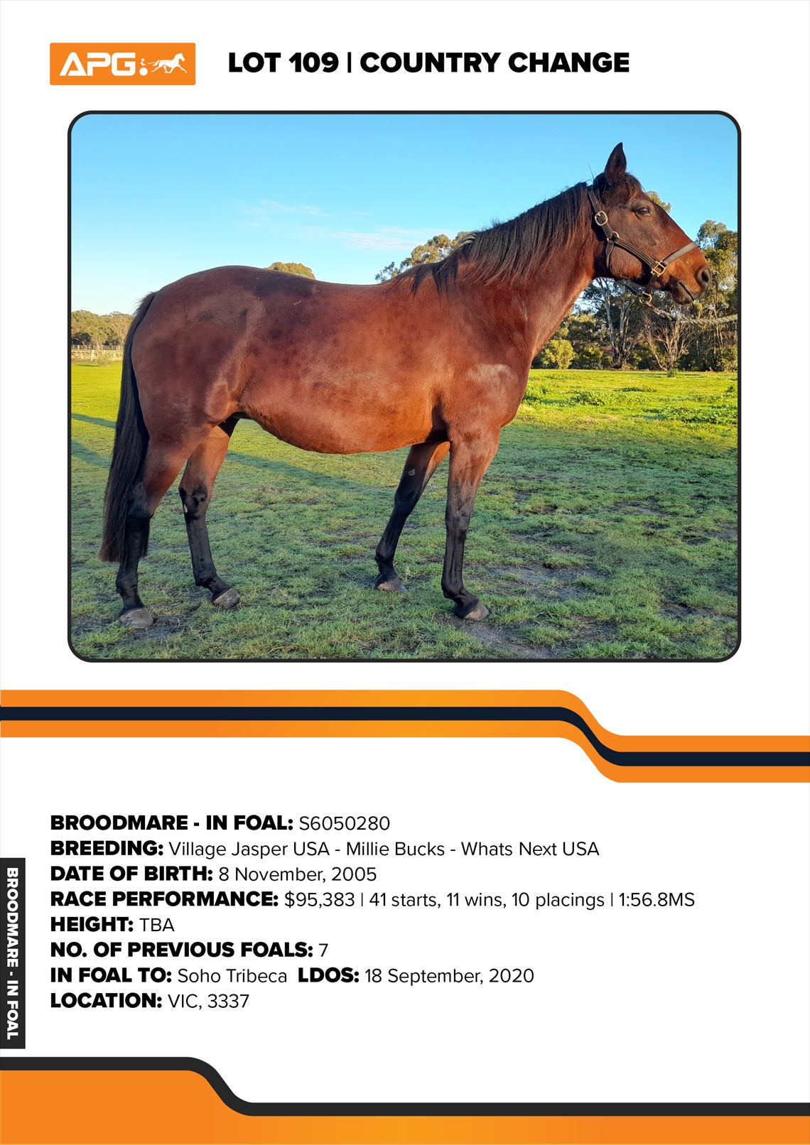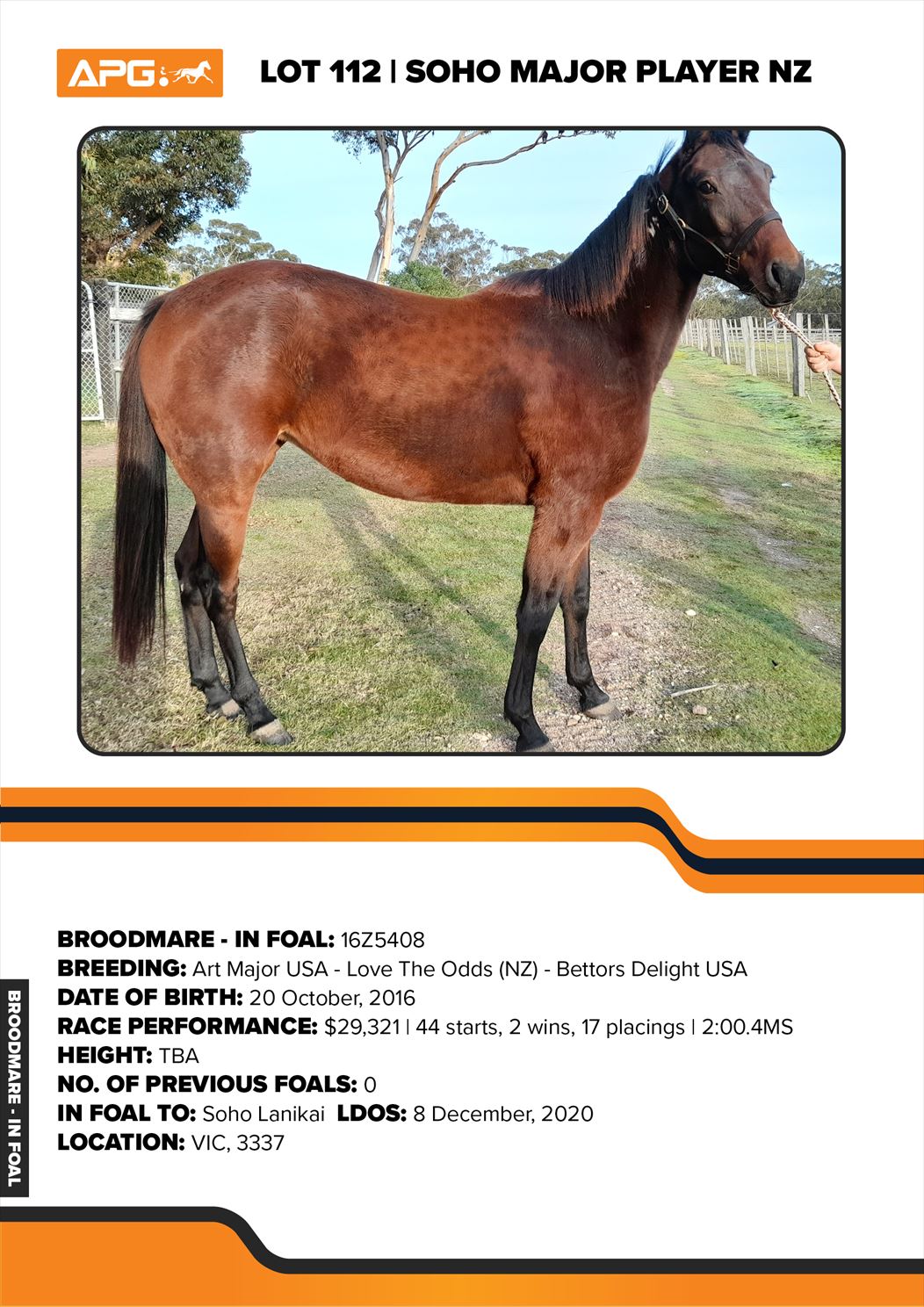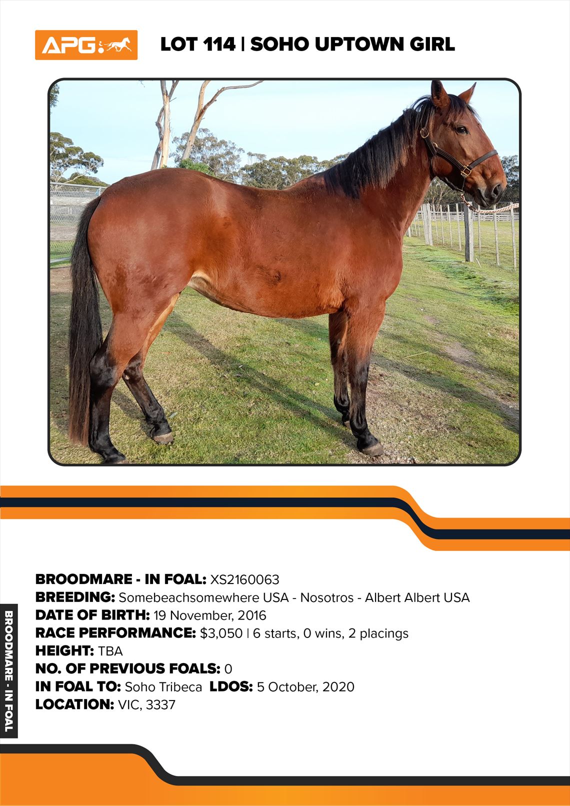 | Mare | Soho Champagne | Artsplace (US) | Miss Maddy Jay NZ | Soho Standardbreds | VIC, 3337 | Highfield Farm P/L | $7,500 |