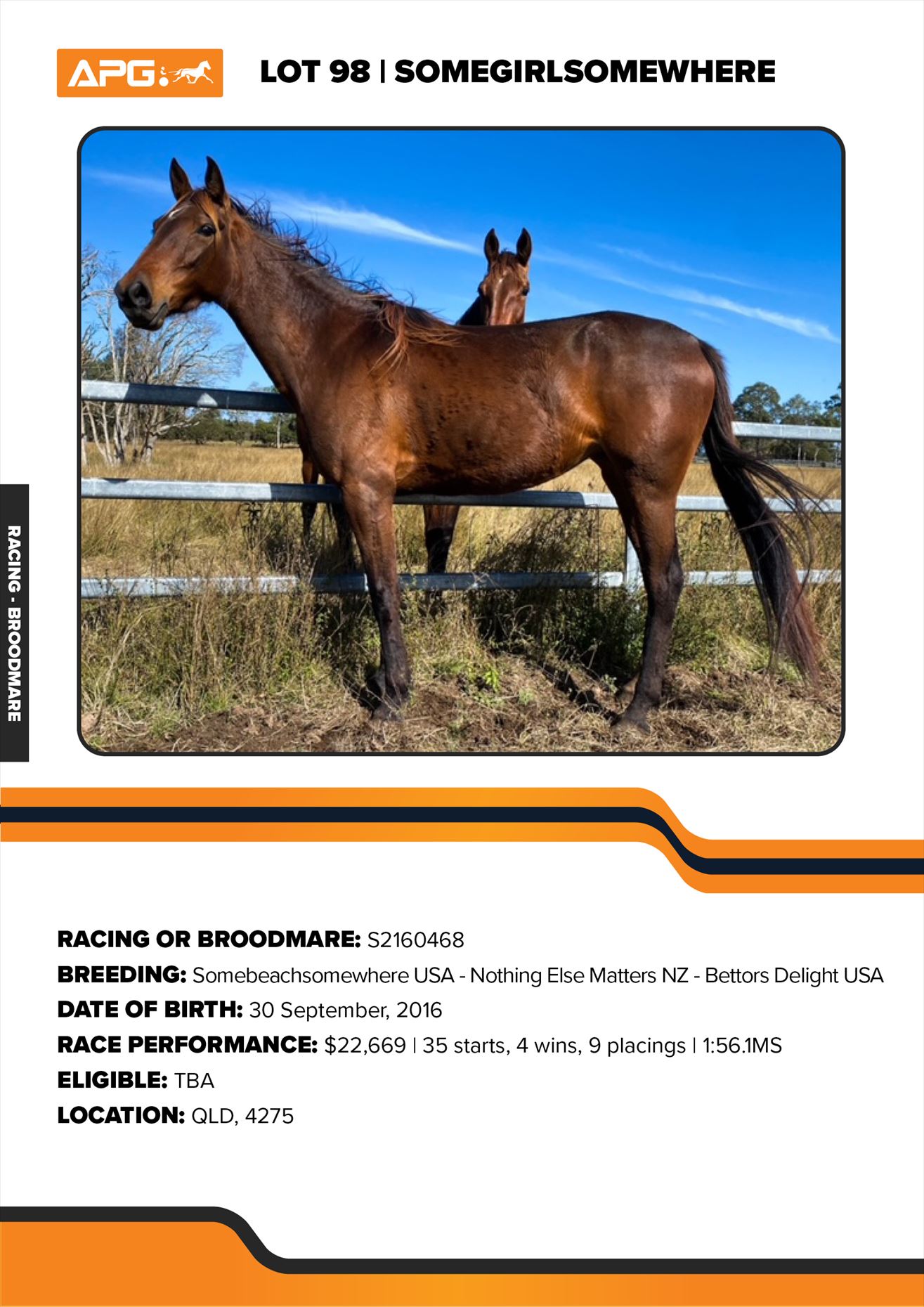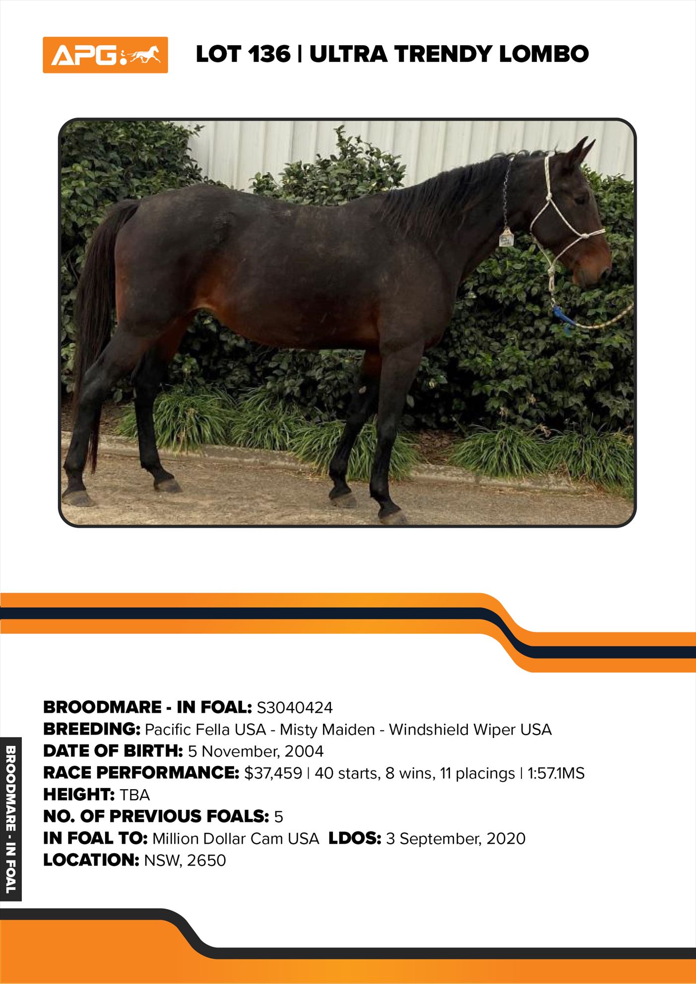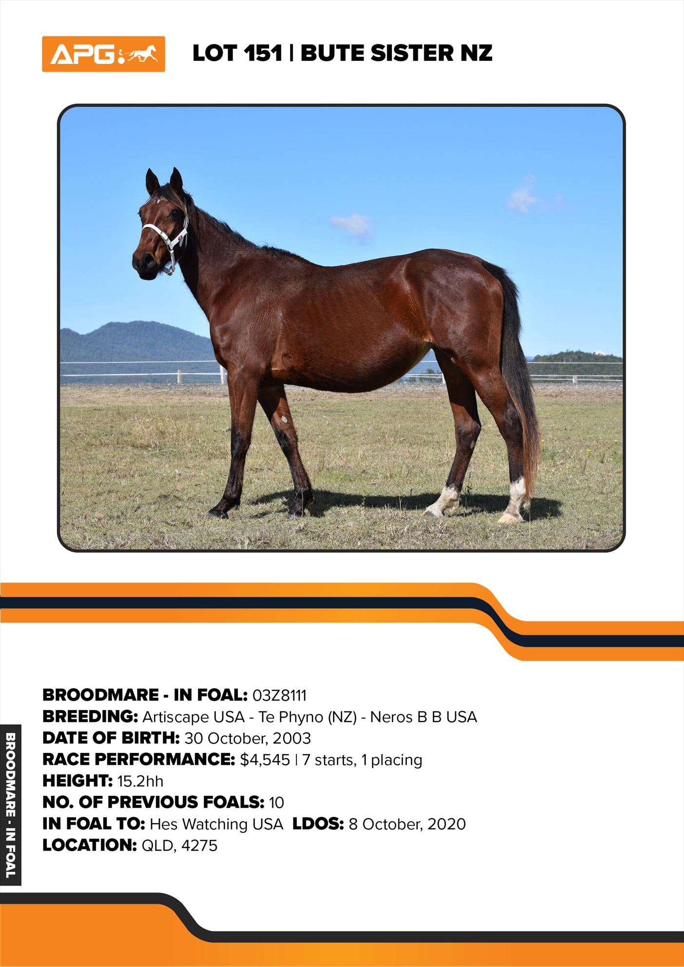 | Mare | Yuno My Brutha USA | Mystic Coal (US) | Queen Tut (US) | Trump Bloodstock Pty Ltd | QLD, 4340 |