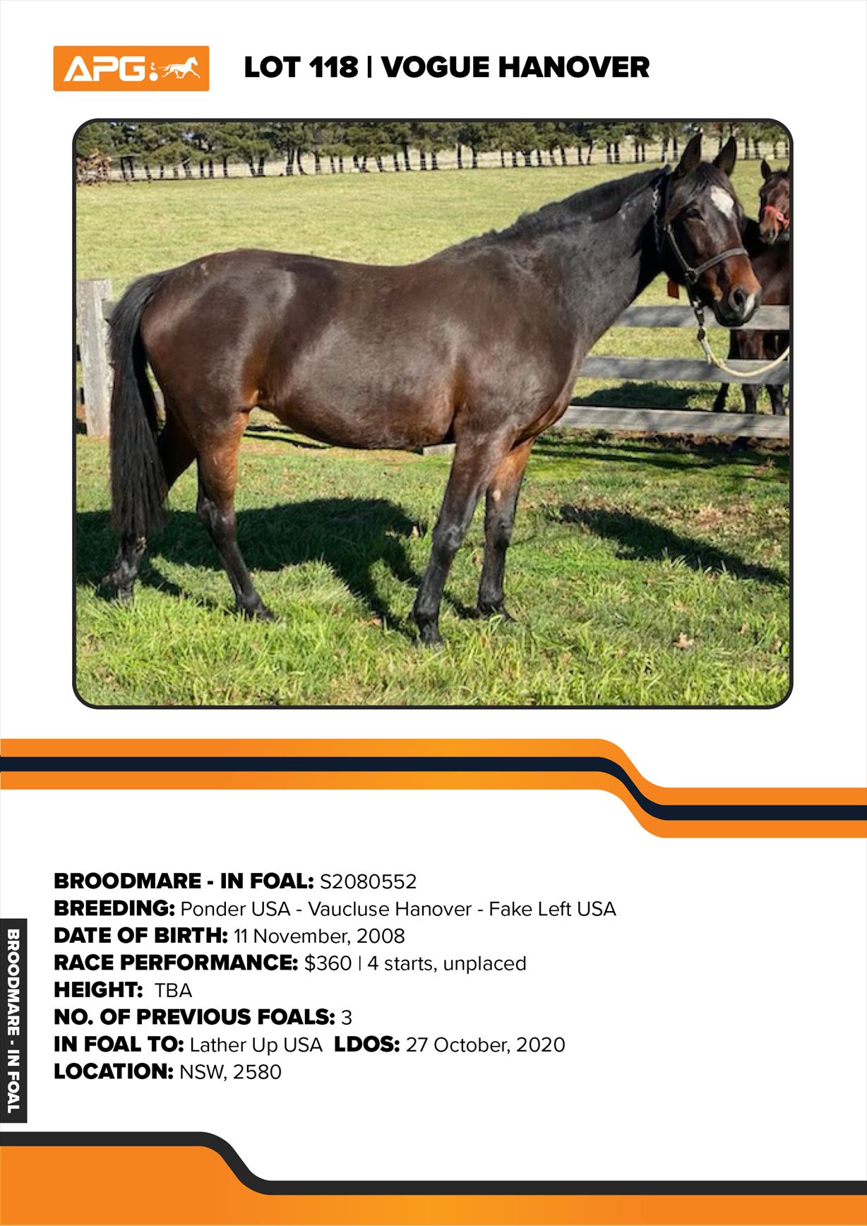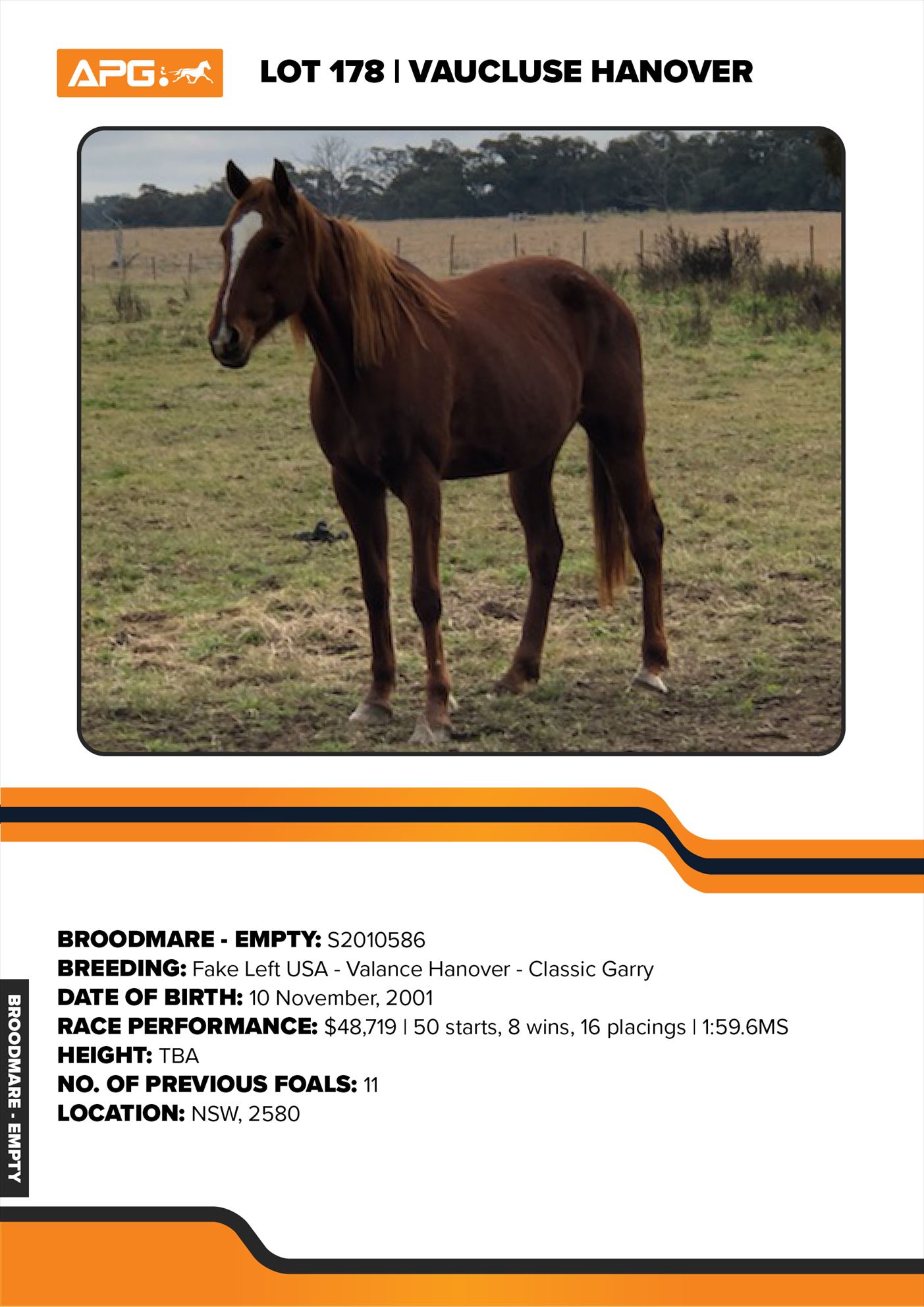 | Mare | Vaucluse Hanover | Fake Left USA | Valance Hanover | Estate of Charlie Peter Furina, Murray Cole & Beau Watson | NSW, 2580 |