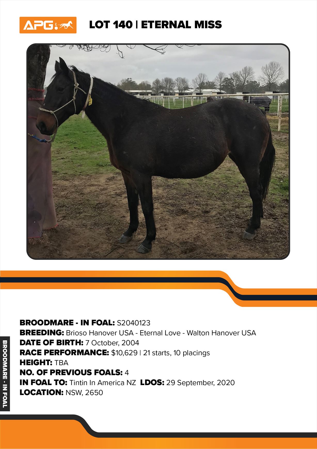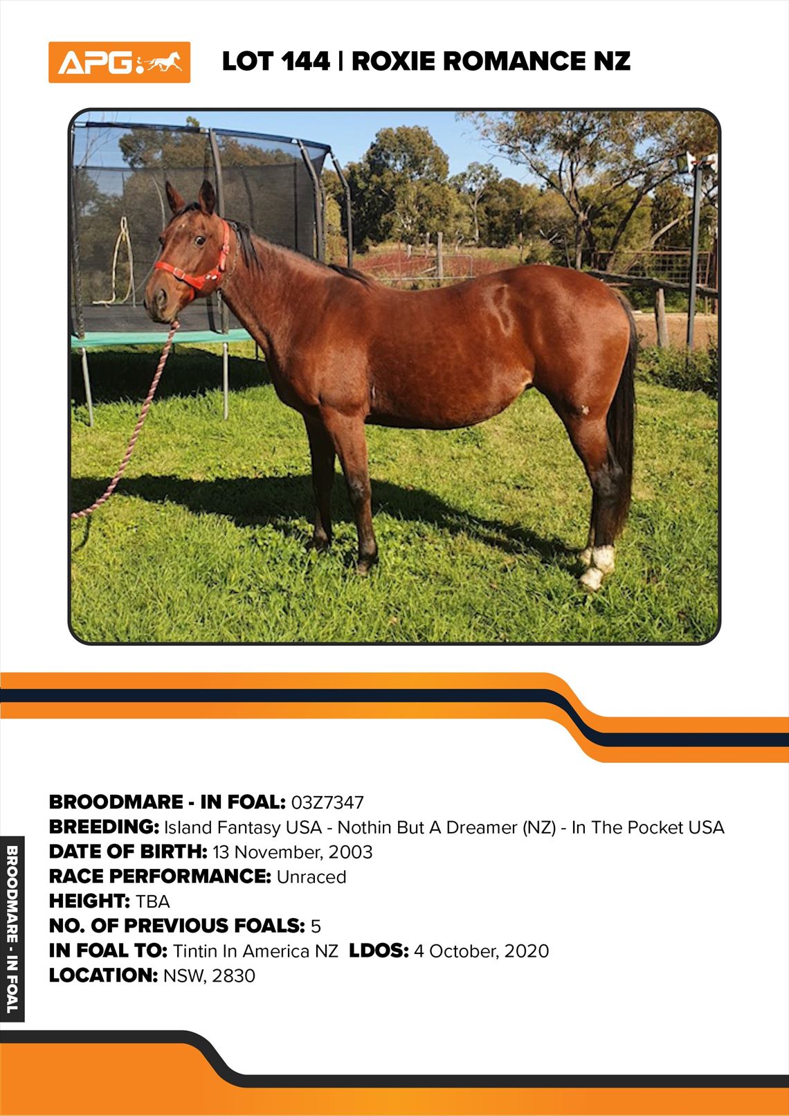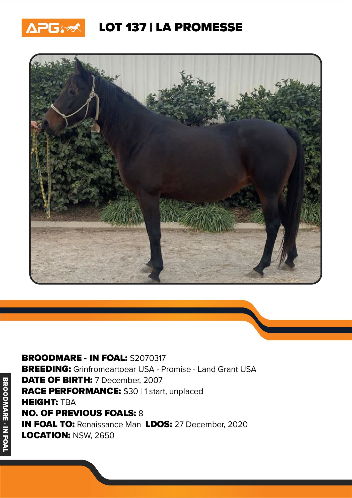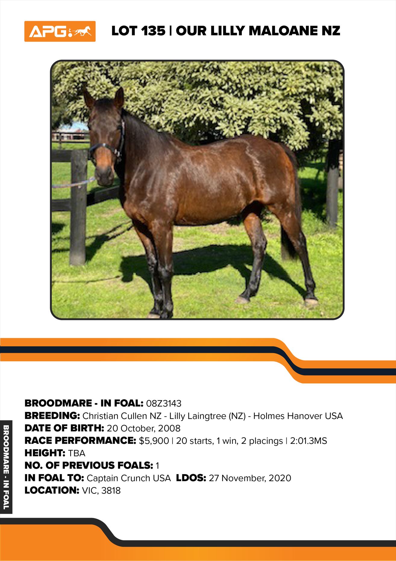 | Mare(+) | Tralee Bromac NZ | Royal Mattjesty USA | Timpany Franco (NZ) | Brisbane Pastoral Company Pty Ltd | QLD, 4275 | Jamie Durnberger-Smith | $12,000 |
