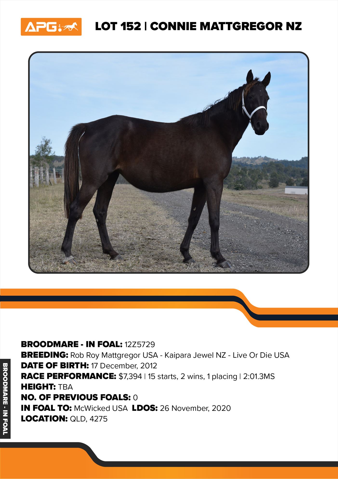 | Mare(+) | Connie Mattgregor NZ | Rob Roy Mattgregor USA | Kaipara Jewel (NZ) | Brisbane Pastoral Company Pty Ltd | QLD, 4275 | Burwood Stud | $4,400 |