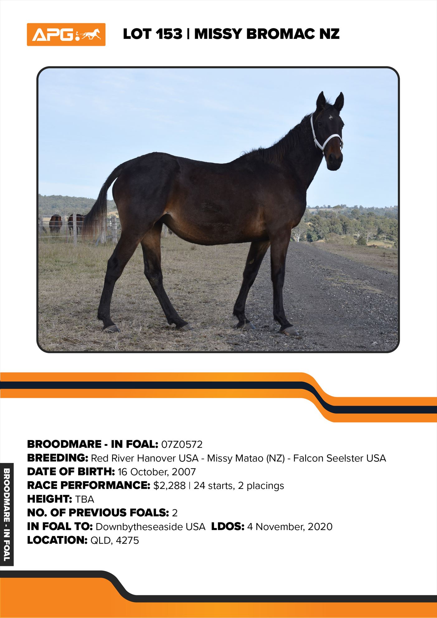 | Mare(+) | Missy Bromac NZ | Red River Hanover USA | Missy Matao (NZ) | Brisbane Pastoral Company Pty Ltd | QLD, 4275 | Burwood Stud | $6,750 |